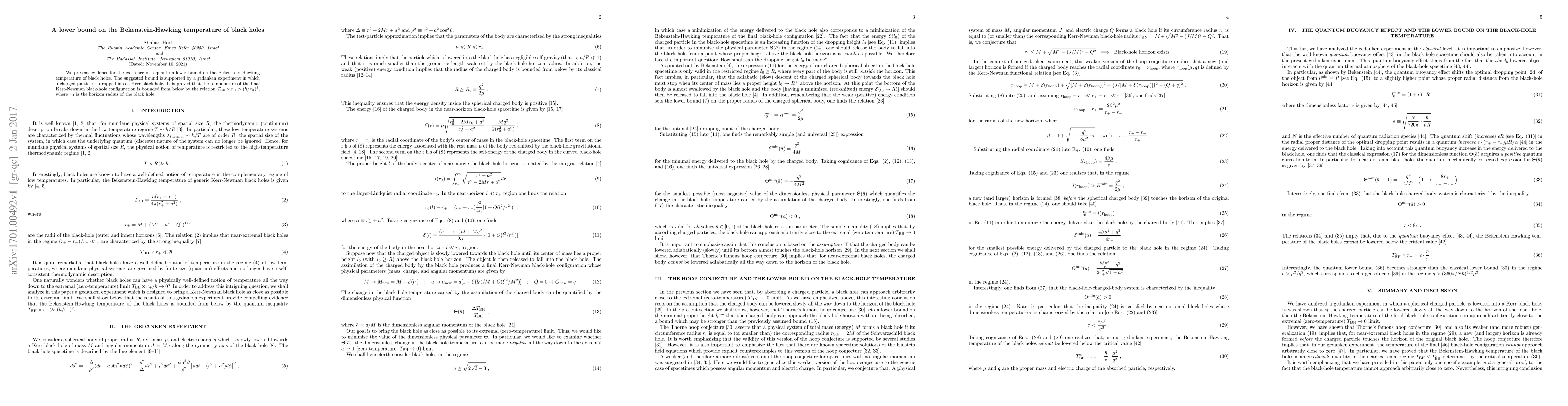 The paper establishes a quantum lower bound for the Bekenstein-Hawking temperature of black holes using a gedanken experiment involving a charged particle dropped into a Kerr black hole, showing that $T_{\text{BH}}\times r_{\text{H}}>(\hbar/r_{\text{H}})^2$. This suggests fundamental quantum constraints on black hole thermodynamics.