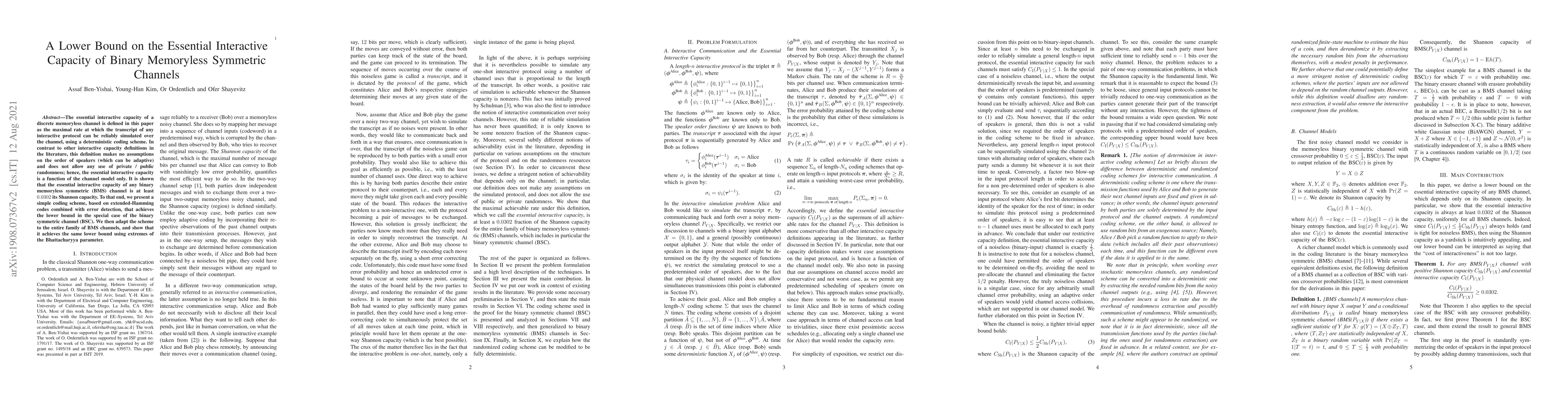 The essential interactive capacity of a discrete memoryless channel is defined in this paper as the maximal rate at which the transcript of any interactive protocol can be reliably simulated over the channel, using a deterministic coding scheme. In contrast to other interactive capacity definitions in the literature, this definition makes no assumptions on the order of speakers (which can be adaptive) and does not allow any use of private / public randomness; hence, the essential interactive capacity is a function of the channel model only. It is shown that the essential interactive capacity of any binary memoryless symmetric (BMS) channel is at least $0.0302$ its Shannon capacity. To that end, we present a simple coding scheme, based on extended-Hamming codes combined with error detection, that achieves the lower bound in the special case of the binary symmetric channel (BSC). We then adapt the scheme to the entire family of BMS channels, and show that it achieves the same lower bound using extremes of the Bhattacharyya parameter.
