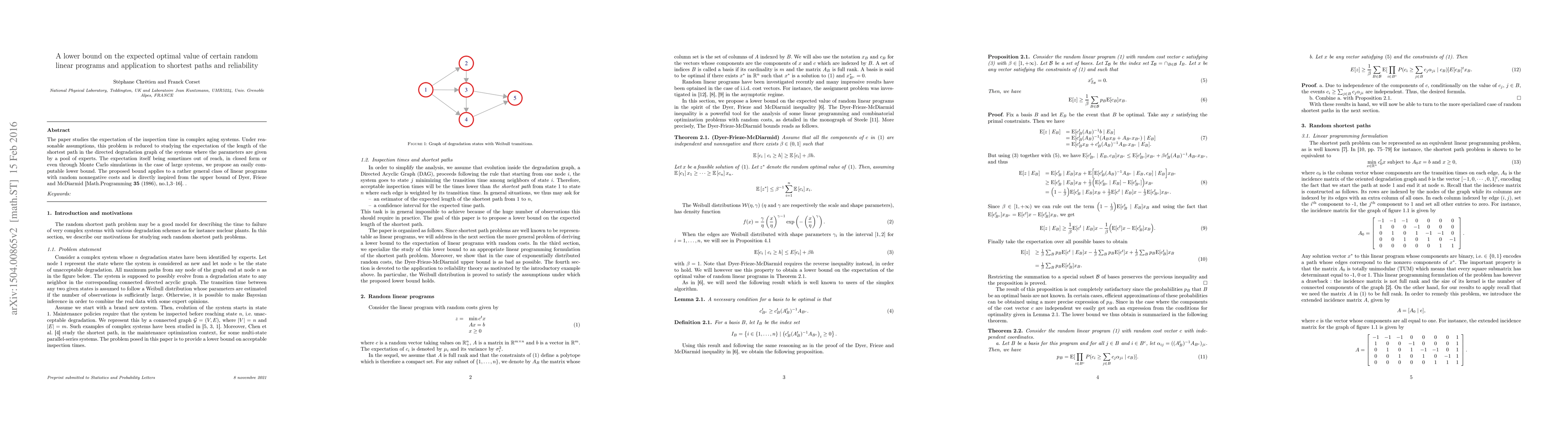 The paper studies the expectation of the inspection time in complex aging systems. Under reasonable assumptions, this problem is reduced to studying the expectation of the length of the shortest path in the directed degradation graph of the systems where the parameters are given by a pool of experts. The expectation itself being sometimes out of reach, in closed form or even through Monte Carlo simulations in the case of large systems, we propose an easily computable lower bound. The proposed bound applies to a rather general class of linear programs with random nonnegative costs and is directly inspired from the upper bound of Dyer, Frieze and McDiarmid [Math.Programming {\bf 35} (1986), no.1,3--16].