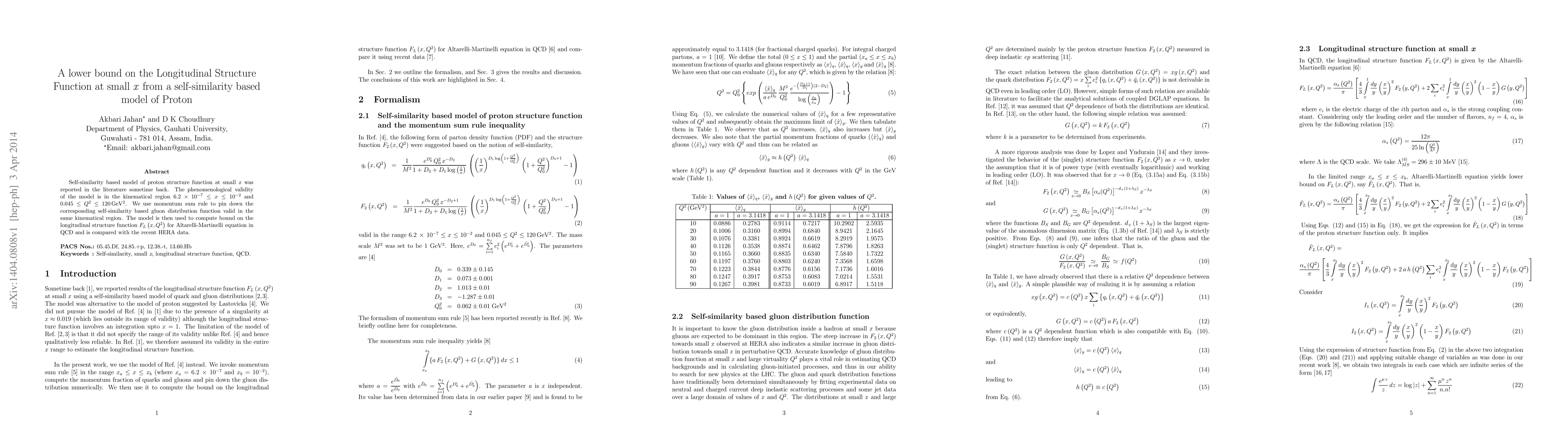 Self-similarity based model of proton structure function at small \textit{x} was reported in the literature sometime back. The phenomenological validity of the model is in the kinematical region $ 6.2\, \times \, 10^{-7} \leq x \leq 10^{-2}$ and $ 0.045 \leq Q^{2} \leq 120 \, \mathrm{GeV^{2}} $. We use momentum sum rule to pin down the corresponding self-similarity based gluon distribution function valid in the same kinematical region. The model is then used to compute bound on the longitudinal structure function $F_{L}\left(x,Q^{2} \right)$ for Altarelli-Martinelli equation in QCD and is compared with the recent HERA data.