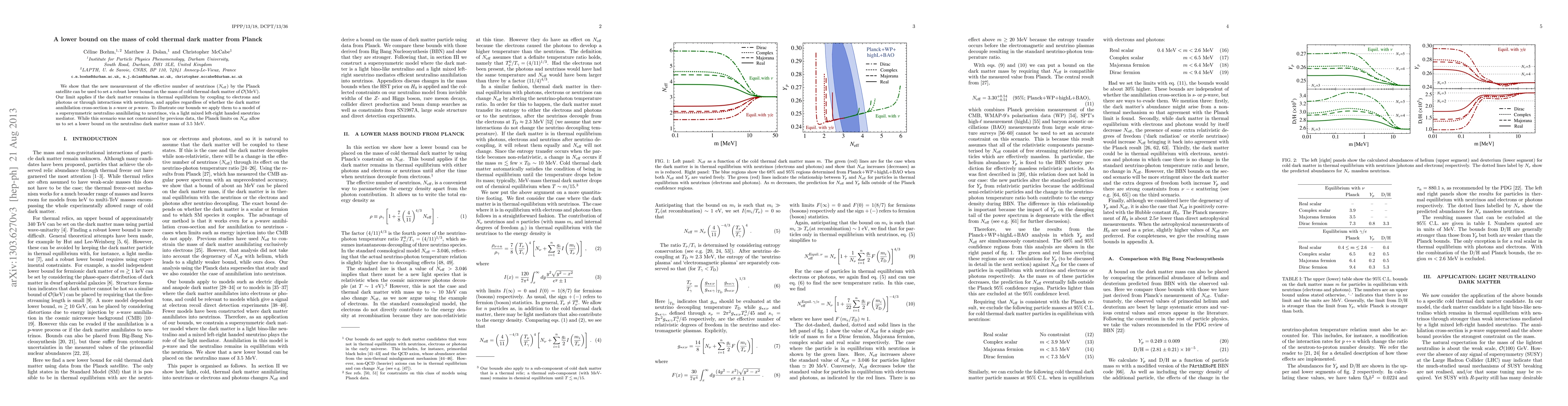 This paper establishes a lower mass limit of O(MeV) for cold thermal dark matter using Planck satellite measurements of the effective number of neutrinos Neff. The derived limit applies irrespective of the dark matter annihilation mechanism, setting a new lower bound of 3.5 MeV for supersymmetric neutralino dark matter.