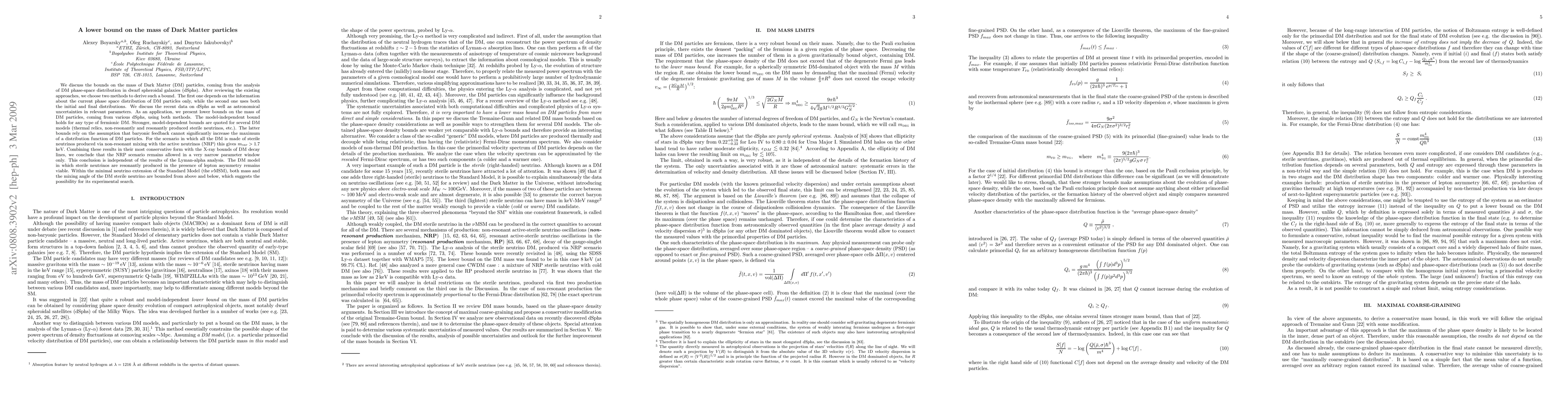 This paper establishes lower bounds on the mass of Dark Matter particles using data from dwarf spheroidal galaxies, applying two methods: one based on current phase space distribution and another using both initial and final distributions. The study finds that for sterile neutrinos produced via non-resonant mixing, the mass must be greater than 1.7 keV, while the resonant production scenario remains viable.