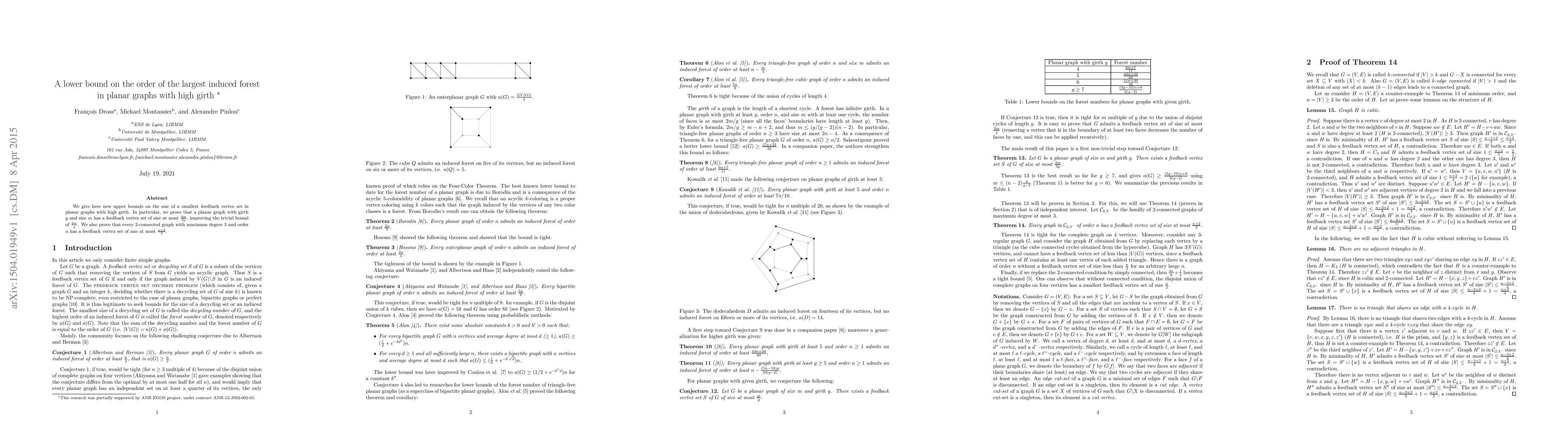 Summary: The paper establishes new upper bounds for the size of feedback vertex sets in planar graphs with high girth, showing that such graphs have a feedback vertex set size of at most $\frac{4m}{3g}$, and proves a similar bound for 2-connected graphs with maximum degree 3.