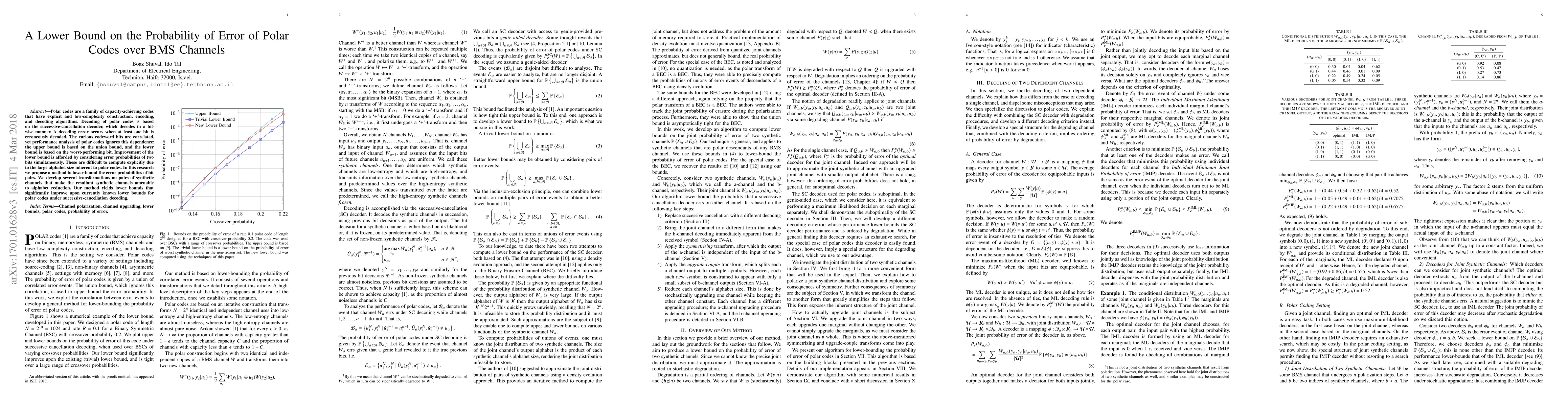 Polar codes are a family of capacity-achieving codes that have explicit and low-complexity construction, encoding, and decoding algorithms. Decoding of polar codes is based on the successive-cancellation decoder, which decodes in a bit- wise manner. A decoding error occurs when at least one bit is erroneously decoded. The various codeword bits are correlated, yet performance analysis of polar codes ignores this dependence: the upper bound is based on the union bound, and the lower bound is based on the worst-performing bit. Improvement of the lower bound is afforded by considering error probabilities of two bits simultaneously. These are difficult to compute explicitly due to the large alphabet size inherent to polar codes. In this research we propose a method to lower-bound the error probabilities of bit pairs. We develop several transformations on pairs of synthetic channels that make the resultant synthetic channels amenable to alphabet reduction. Our method yields lower bounds that significantly improve upon currently known lower bounds for polar codes under successive-cancellation decoding.