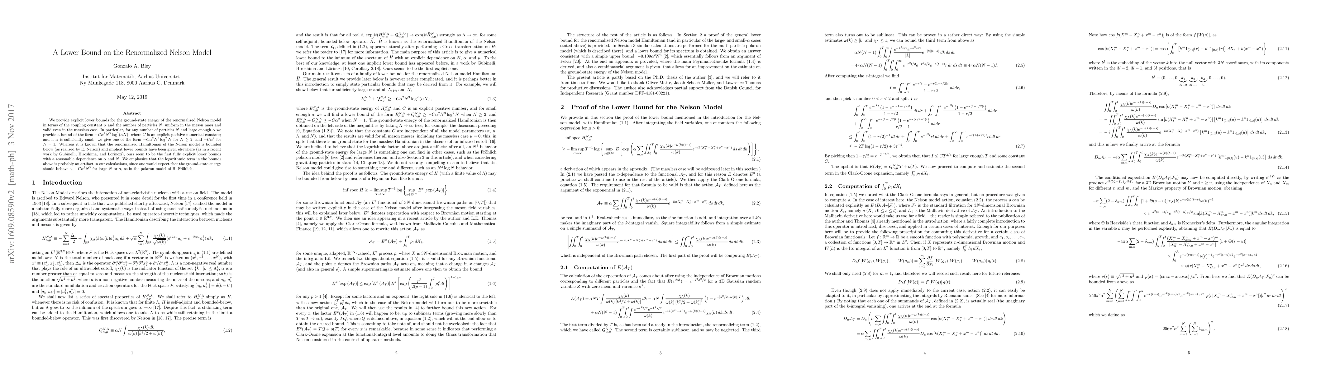The research paper provides explicit lower bounds for the ground-state energy of the renormalized Nelson model, showing that it behaves as $-C ext{²} ext{N}^3 ext{π}^2$ for large N or ext{²}, with a logarithmic term that is likely an artifact in the calculations.