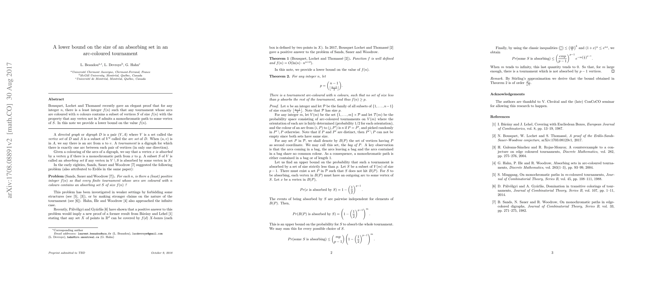 This research paper presents a lower bound for the size of an absorbing set in an arc-coloured tournament, improving upon previous work by Bousquet, Lochet, and Thomassé. The study focuses on tournaments with coloured arcs, identifying a minimum subset of vertices necessary to ensure a monochromatic path to any vertex outside the subset.