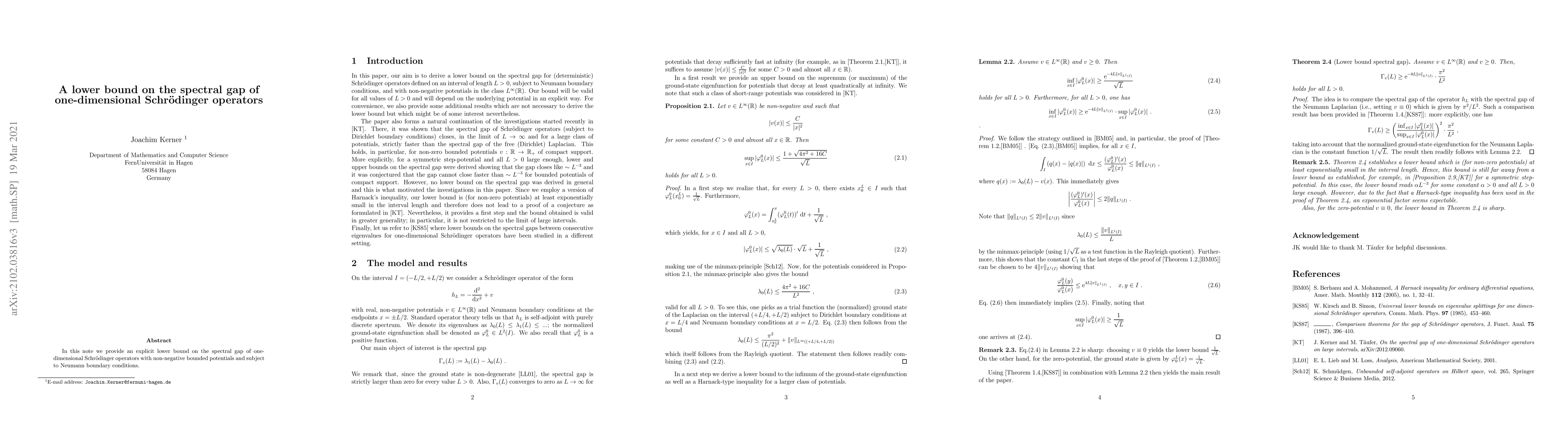 Summary: This paper establishes an explicit lower bound for the spectral gap of one-dimensional Schrödinger operators with non-negative bounded potentials, constrained by Neumann boundary conditions. The result provides insight into the behavior of such quantum systems.