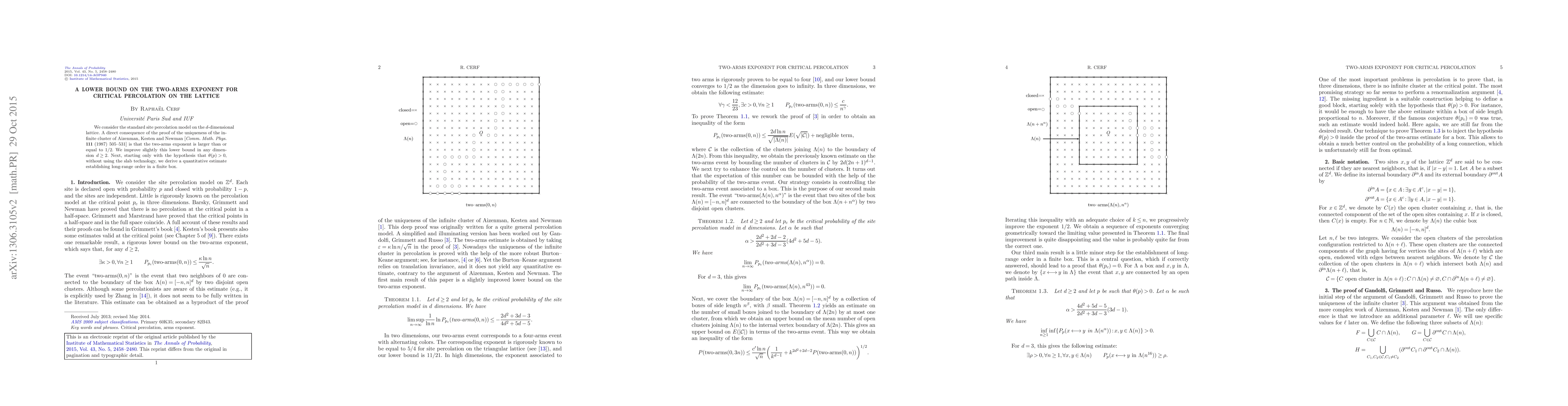 Summary: This paper improves the lower bound on the two-arms exponent for critical percolation on $d$-dimensional lattices, establishing it as greater than or equal to $1/2$ in any dimension $d\geq2$. The authors also provide a quantitative estimate of long-range order in a finite box under the assumption that $\theta(p)>0$.