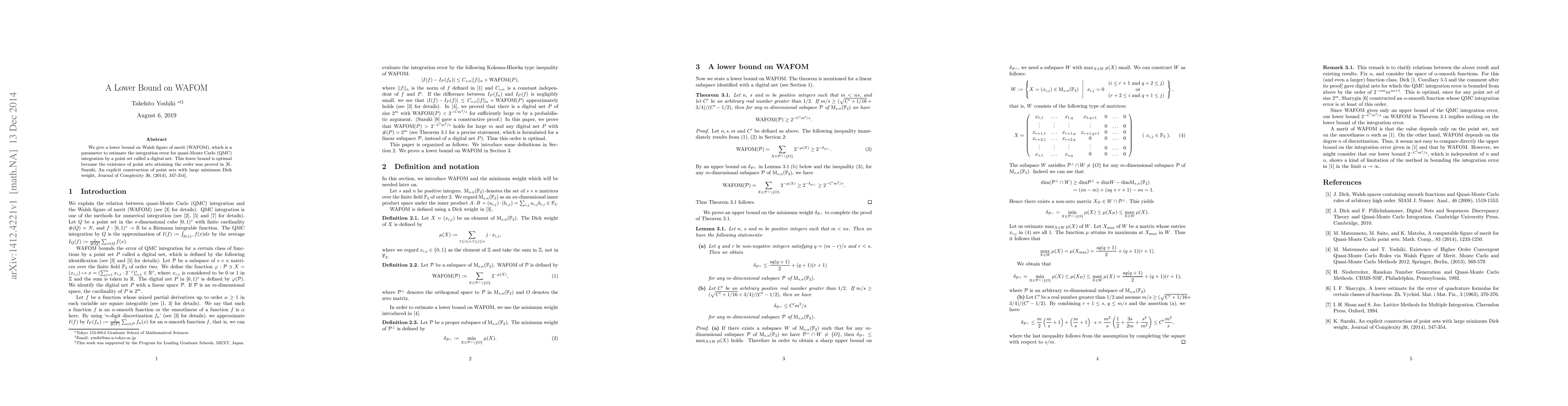 We give a lower bound on Walsh figure of merit (WAFOM), which is a parameter to estimate the integration error for quasi-Monte Carlo (QMC) integration by a point set called a digital net. This lower bound is optimal because the existence of point sets attaining the order was proved in [K. Suzuki, An explicit construction of point sets with large minimum Dick weight, Journal of Complexity 30, (2014), 347-354].