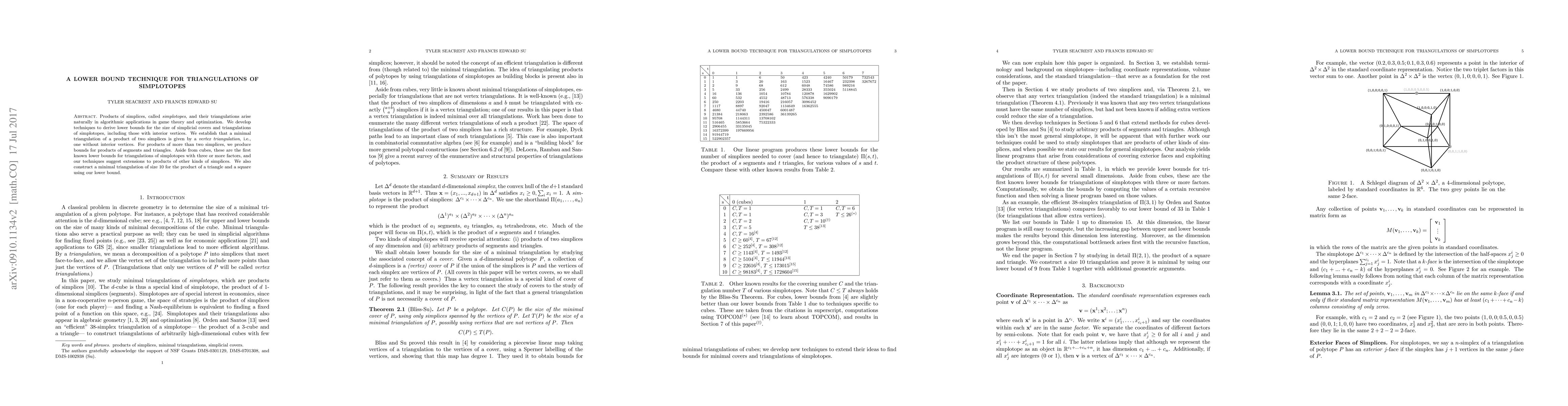 Products of simplices, called simplotopes, and their triangulations arise naturally in algorithmic applications in game theory and optimization. We develop techniques to derive lower bounds for the size of simplicial covers and triangulations of simplotopes, including those with interior vertices. We establish that a minimal triangulation of a product of two simplices is given by a vertex triangulation, i.e., one without interior vertices. For products of more than two simplices, we produce bounds for products of segments and triangles. Aside from cubes, these are the first known lower bounds for triangulations of simplotopes with three or more factors, and our techniques suggest extensions to products of other kinds of simplices. We also construct a minimal triangulation of size 10 for the product of a triangle and a square using our lower bound.