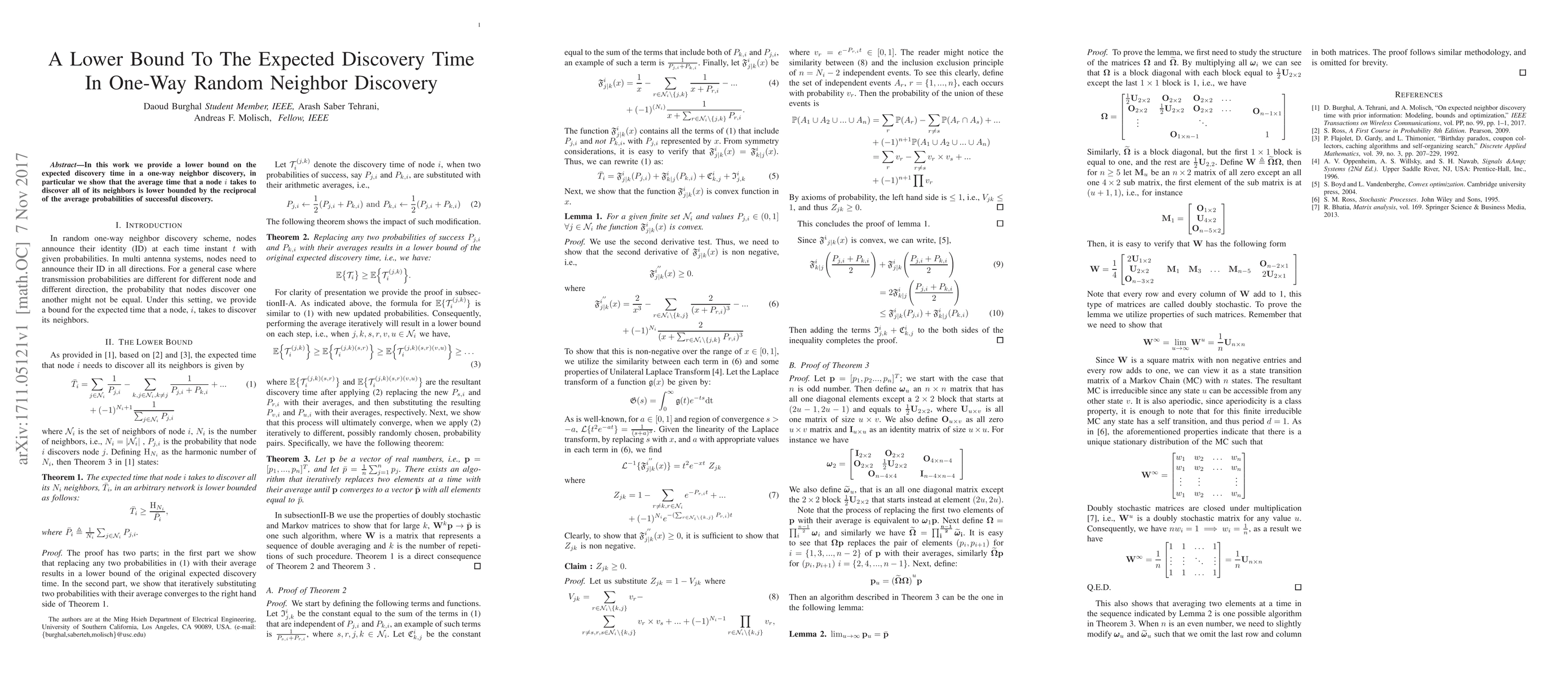 We provide a lower bound on the expected discovery time of one-way neighbor discovery in multi antenna system. We assume that the scheme allows to use different directional transmission probabilities, which result in different probability of successful discovery between nodes. The proof shows that the lower bound to the expected discovery time, that node $i$ takes to discover its neighbors, is given by the reciprocal of the average probabilities of successful discovery.