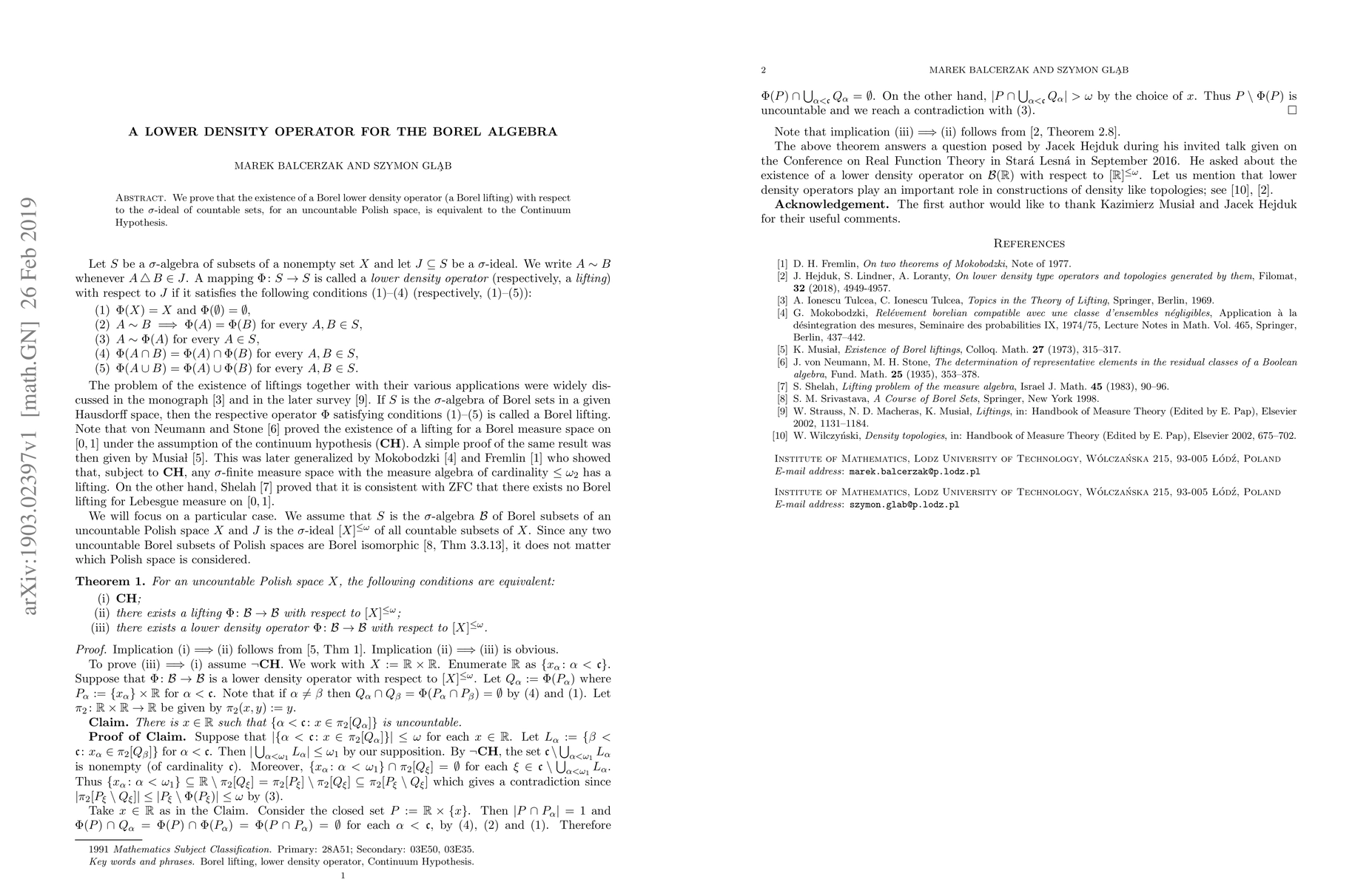 We prove that the existence of a Borel lower density operator (a Borel lifting) with respect to the $\sigma$-ideal of countable sets, for an uncountable Polish space, is equivalent to the Continuum Hypothesis.