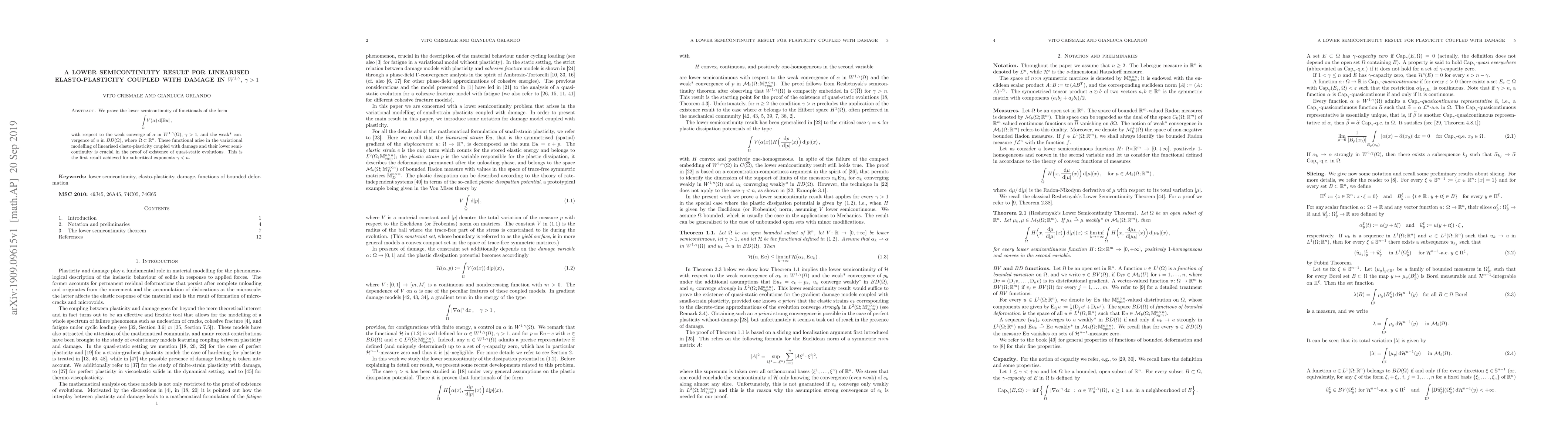 This paper proves the lower semicontinuity of functionals related to linearised elasto-plasticity coupled with damage in the function space $W^{1,\gamma}(\Omega)$, $\gamma > 1$. This result is significant for establishing the existence of quasi-static evolutions in the variational modelling of such systems.