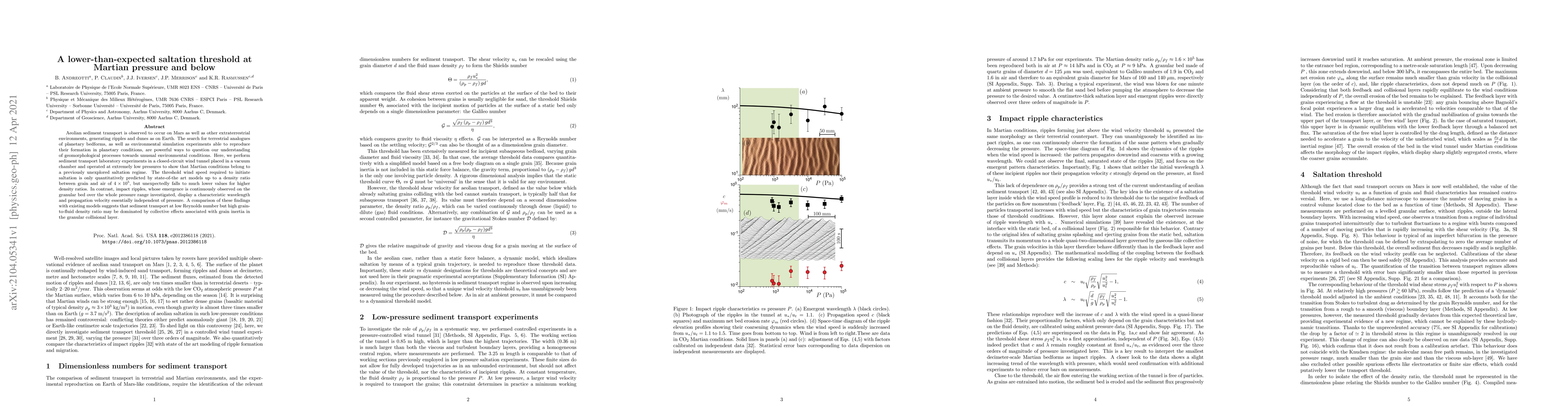 This study reveals that Martian conditions lead to a lower-than-expected threshold for saltation, challenging existing models. Impact ripples observed show consistent behavior across varying pressures, suggesting collective grain effects dominate sediment transport under low Reynolds number conditions.