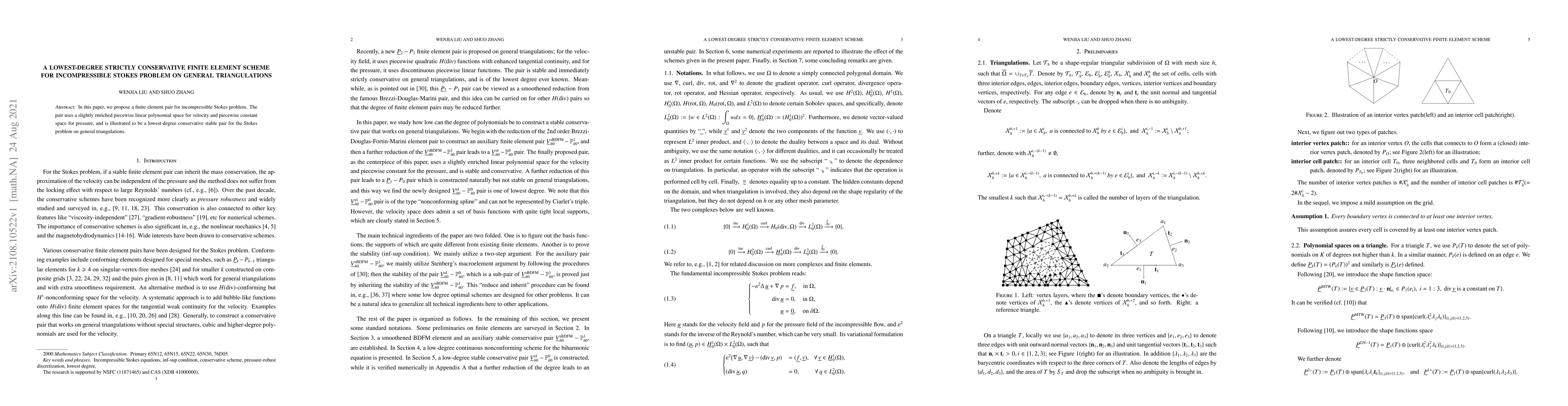 Summary: This paper proposes a lowest-degree conservative finite element scheme for the incompressible Stokes problem, utilizing a slightly enriched piecewise linear velocity field and a piecewise constant pressure field, ensuring stability and conservation on general triangulations.