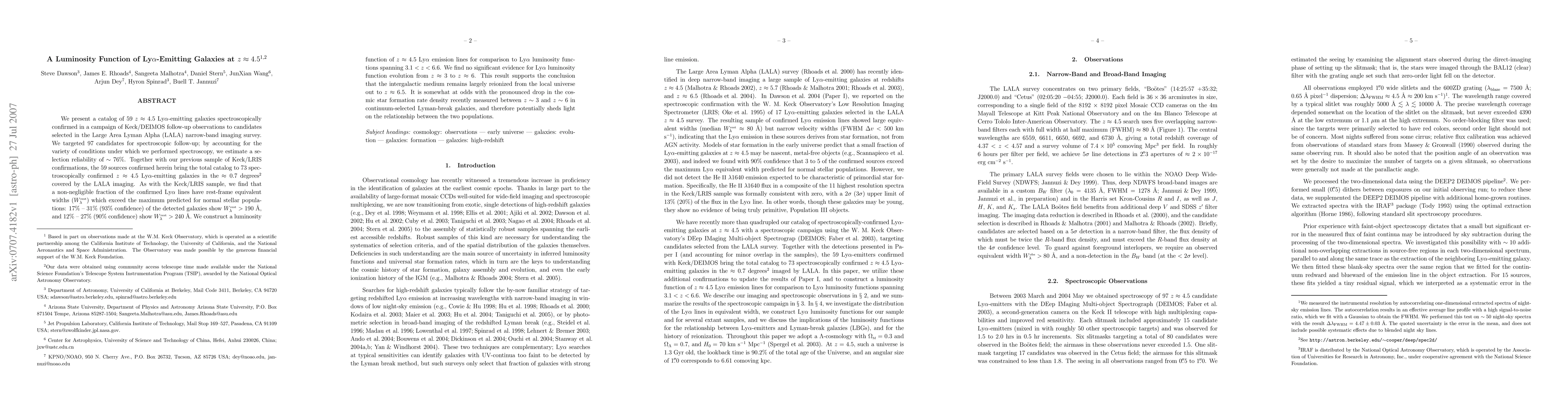 This paper catalogs 59 spectroscopically confirmed Lyman alpha emitting galaxies at z=4.5, contributing to a total of 73 such galaxies. It finds no significant evolution in the Lyman alpha luminosity function from z ~ 3 to z ~ 6, supporting the idea that the intergalactic medium remains largely reionized up to z=6.5, despite a drop in cosmic star formation rate density.
