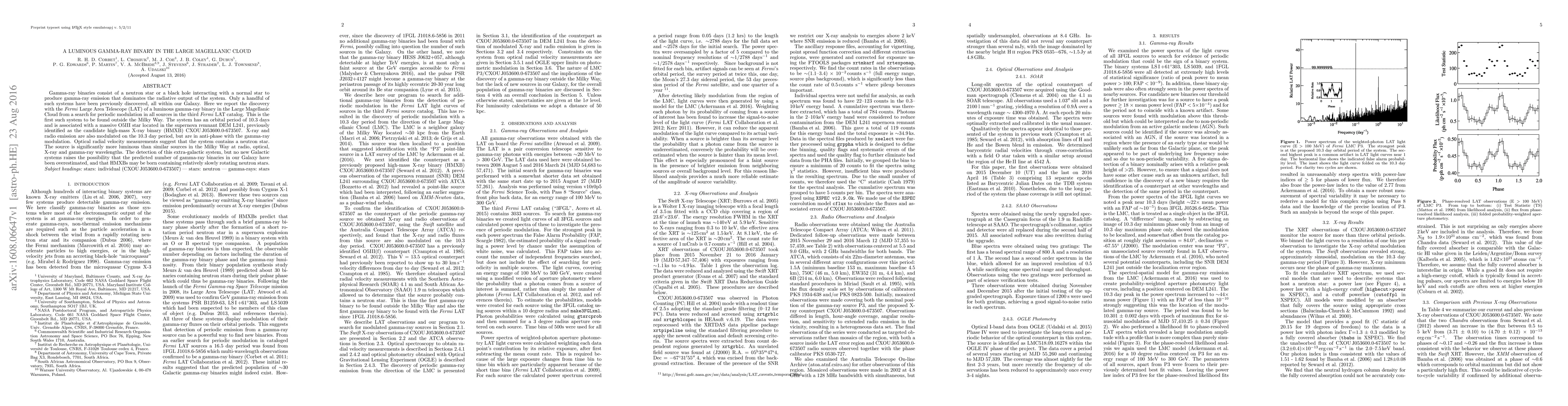 This paper reports the discovery of a luminous gamma-ray binary outside the Milky Way in the Large Magellanic Cloud, detected by the Fermi LAT, marking the first such system found extra-galactically. The system, associated with an O5III star, exhibits modulated gamma-ray, X-ray, and radio emissions, suggesting a neutron star and raising questions about the number of similar systems in our Galaxy.
