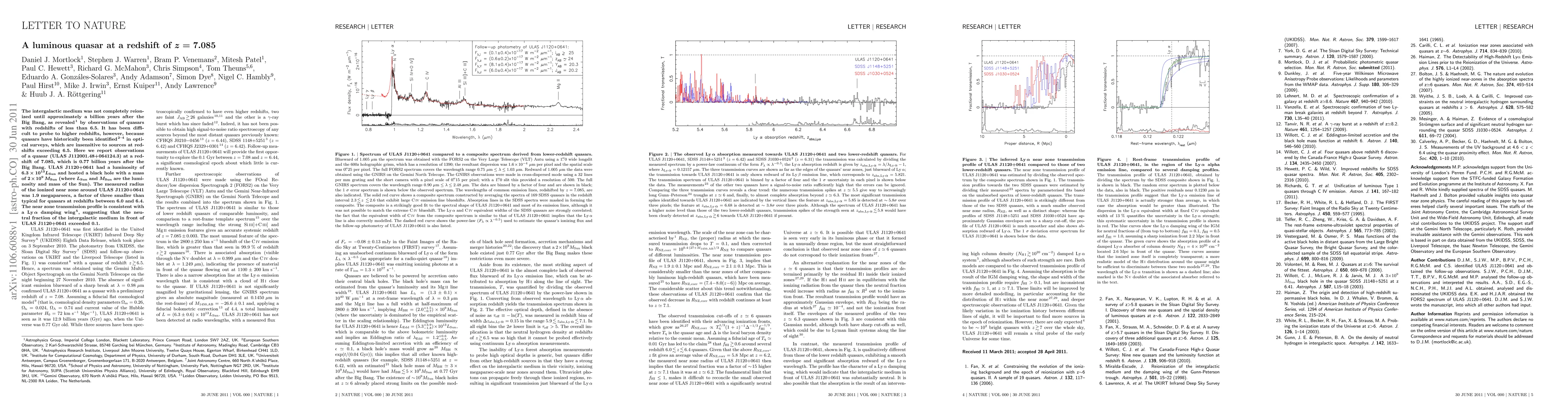 This paper reports the discovery of a luminous quasar at a redshift of z = 7.085, providing evidence of the intergalactic medium's reionization 0.77 billion years after the Big Bang. The quasar's smaller ionized near zone suggests a higher neutral hydrogen fraction than typical for lower redshift quasars.