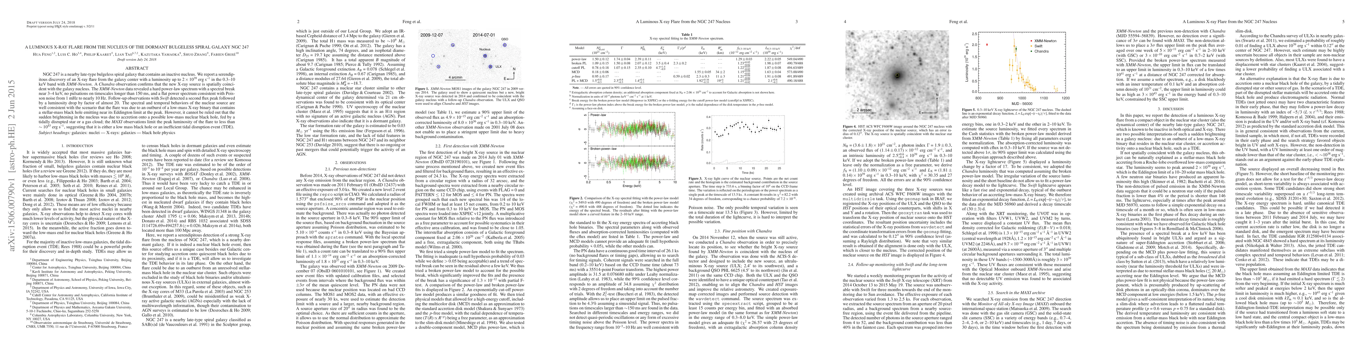 This paper reports an unexpected X-ray flare from the nucleus of the dormant, bulgeless spiral galaxy NGC 247, detected by XMM-Newton and confirmed by Chandra. The flare's spectral and temporal characteristics suggest it may be due to a low-mass X-ray binary or a tidal disruption event, though the exact nature remains uncertain.