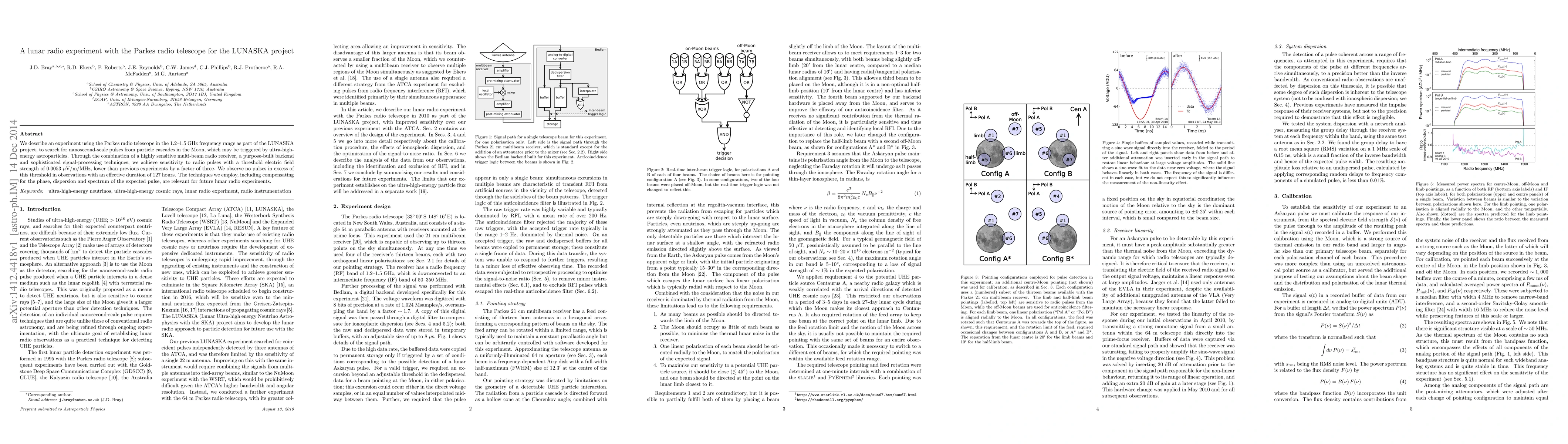 The study details a lunar radio experiment using the Parkes telescope, aiming to detect nanosecond pulses from particle cascades on the Moon, potentially triggered by ultra-high-energy astroparticles. The experiment achieved unprecedented sensitivity, setting a threshold for electric field strength 1.5 times lower than previous attempts, but found no excess pulses in 127 hours of observation.