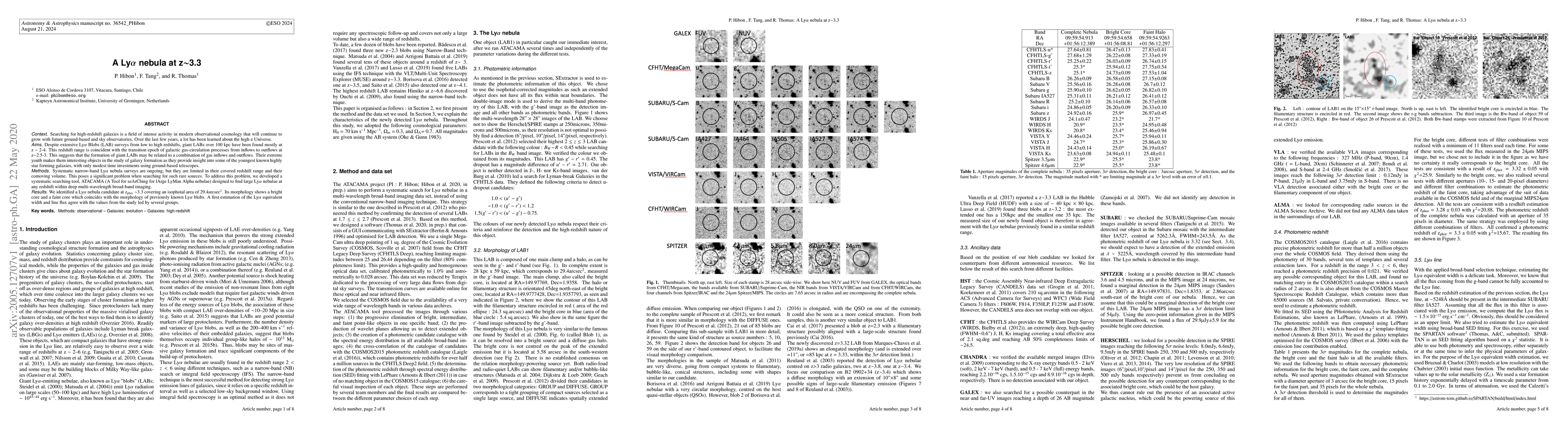 Context. Searching for high-redshift galaxies is a field of intense activity in modern observational cosmology that will continue to grow with future ground-based and sky observatories. Over the last few years, a lot has been learned about the high-z Universe. Aims. Despite extensive Ly-alpha Blobs (LAB) surveys from low to high redshifts, giant LABs over 100 kpc have been found mostly at z~2-4. This redshift range is coincident with the transition epoch of galactic gas-circulation processes from inflows to outflows at z~2.5-3. This suggests that the formation of giant LABs may be related to a combination of gas inflows and outflows. Their extreme youth makes them interesting objects in the study of galaxy formation as they provide insight into some of the youngest known highly star forming galaxies, with only modest time investments using ground-based telescopes. Methods. Systematic narrow-band Ly-alpha nebula surveys are ongoing, but they are limited in their covered redshift range and their comoving volume. This poses a significant problem when searching for such rare sources. To address this problem, we developed a systematic searching tool, ATACAMA (A Tool for seArChing for lArge LyMan Alpha nebulae) designed to find large Ly-alpha nebulae at any redshift within deep multi-wavelength broad-band imaging. Results. We identified a Ly-alpha nebula candidate at zphot~3.3 covering an isophotal area of 29.4sq.arcsec. Its morphology shows a bright core and a faint core which coincides with the morphology of previously known Ly-alpha blobs. A first estimation of the Ly-alpha equivalent width and line flux agree with the values from the study led by several groups.