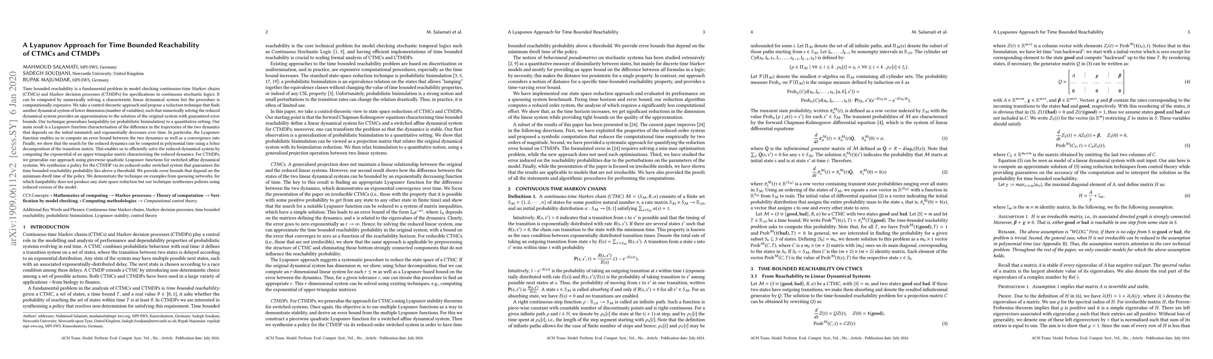 Time bounded reachability is a fundamental problem in model checking continuous-time Markov chains (CTMCs) and Markov decision processes (CTMDPs) for specifications in continuous stochastic logics. It can be computed by numerically solving a characteristic linear dynamical system but the procedure is computationally expensive. We take a control-theoretic approach and propose a reduction technique that finds another dynamical system of lower dimension (number of variables), such that numerically solving the reduced dynamical system provides an approximation to the solution of the original system with guaranteed error bounds. Our technique generalises lumpability (or probabilistic bisimulation) to a quantitative setting. Our main result is a Lyapunov function characterisation of the difference in the trajectories of the two dynamics that depends on the initial mismatch and exponentially decreases over time. In particular, the Lyapunov function enables us to compute an error bound between the two dynamics as well as a convergence rate. Finally, we show that the search for the reduced dynamics can be computed in polynomial time using a Schur decomposition of the transition matrix. This enables us to efficiently solve the reduced dynamical system by computing the exponential of an upper-triangular matrix characterising the reduced dynamics. For CTMDPs, we generalise our approach using piecewise quadratic Lyapunov functions for switched affine dynamical systems. We synthesise a policy for the CTMDP via its reduced-order switched system that guarantees the time bounded reachability probability lies above a threshold. We provide error bounds that depend on the minimum dwell time of the policy. We demonstrate the technique on examples from queueing networks, for which lumpability does not produce any state space reduction but our technique synthesises policies using reduced version of the model.