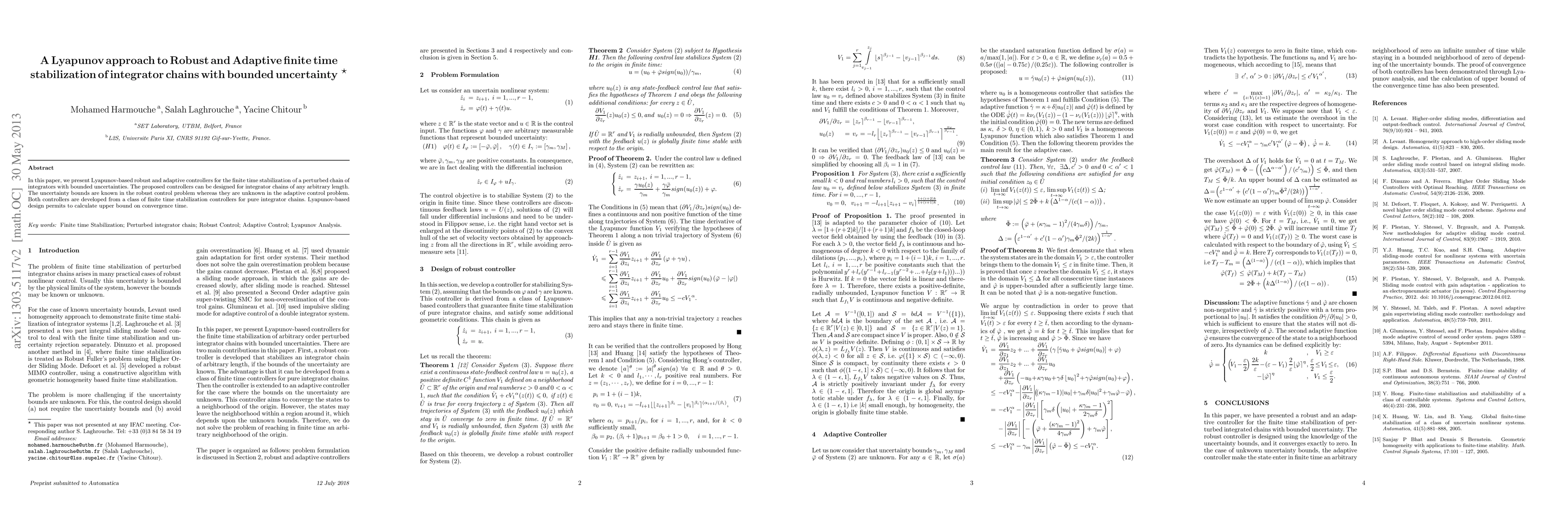 In this paper, we present Lyapunov-based robust and adaptive controllers for the finite time stabilization of a perturbed chain of integrators with bounded uncertainties. The proposed controllers can be designed for integrator chains of any arbitrary length. The uncertainty bounds are known in the robust control problem whereas they are unknown in the adaptive control problem. Both controllers are developed from a class of finite time stabilization controllers for pure integrator chains. Lyapunov-based design permits to calculate upper bound on convergence time.