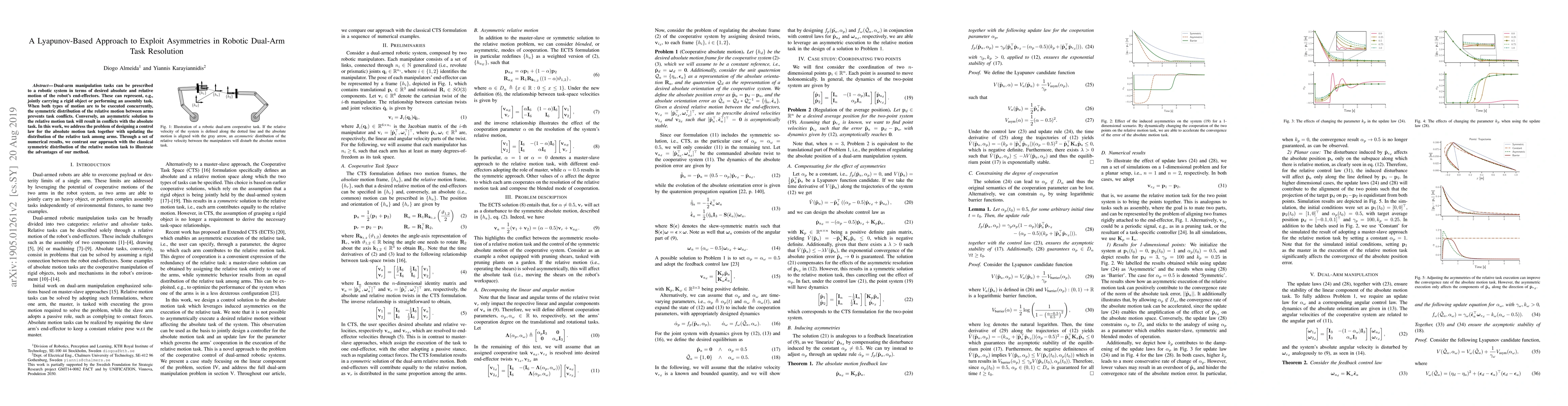 This paper proposes a Lyapunov-based control law to manage dual-arm robotic tasks, focusing on exploiting asymmetries in relative motion to avoid conflicts with absolute motion. The method is shown to outperform traditional symmetric approaches through numerical results.
