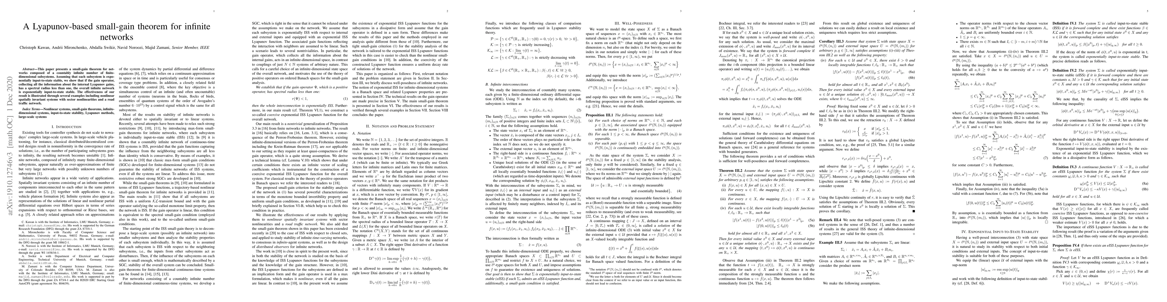 A small-gain theorem for infinite networks is presented, showing that exponential input-to-state stability in finite-dimensional subsystems can lead to overall stability in a countably infinite network with a spectral radius less than one.