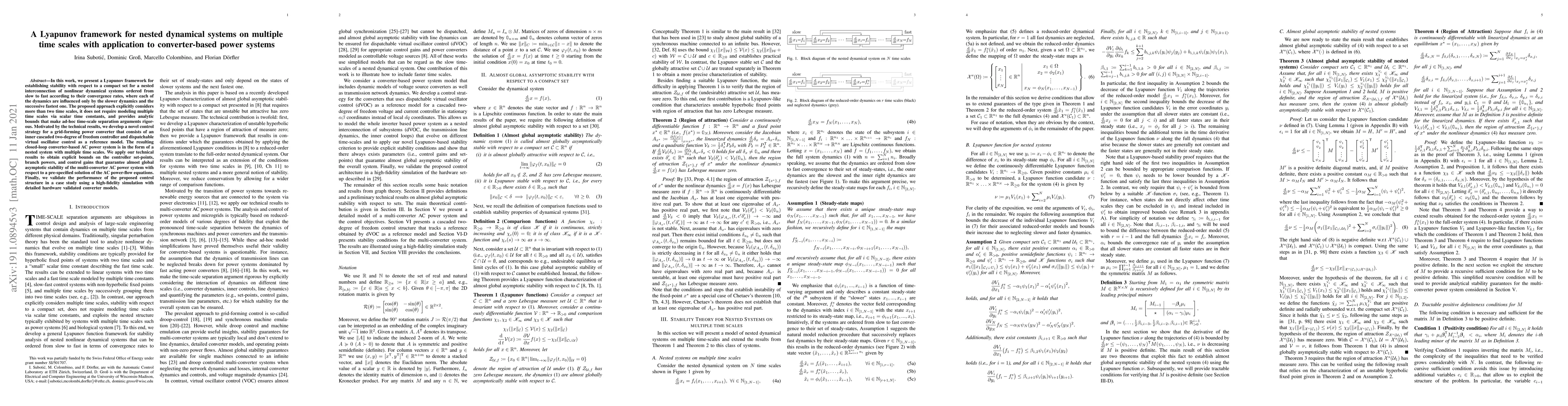 This paper introduces a Lyapunov framework for analyzing nested dynamical systems with multiple time scales, providing rigorous stability proofs without scalar time constants. The framework is applied to develop a control strategy for grid-forming power converters, ensuring almost global asymptotic stability of multi-converter AC power systems.