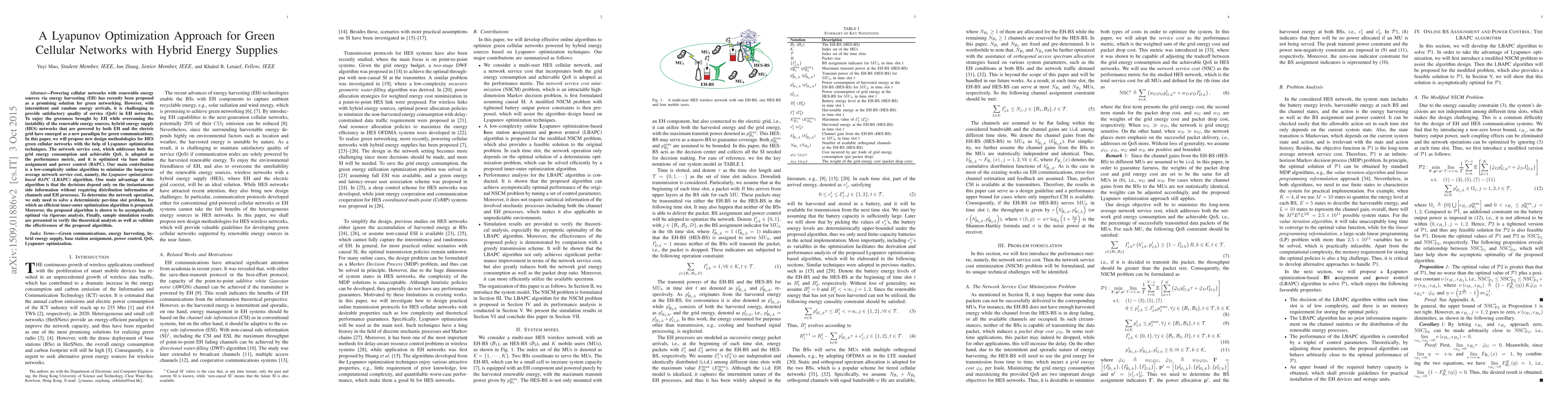 This paper proposes a Lyapunov optimization approach for designing hybrid energy supply (HES) green cellular networks, combining energy harvesting and grid power. The focus is on minimizing the long-term average network service cost through base station assignment and power control, using an efficient online algorithm that requires only instantaneous information, not distribution data.