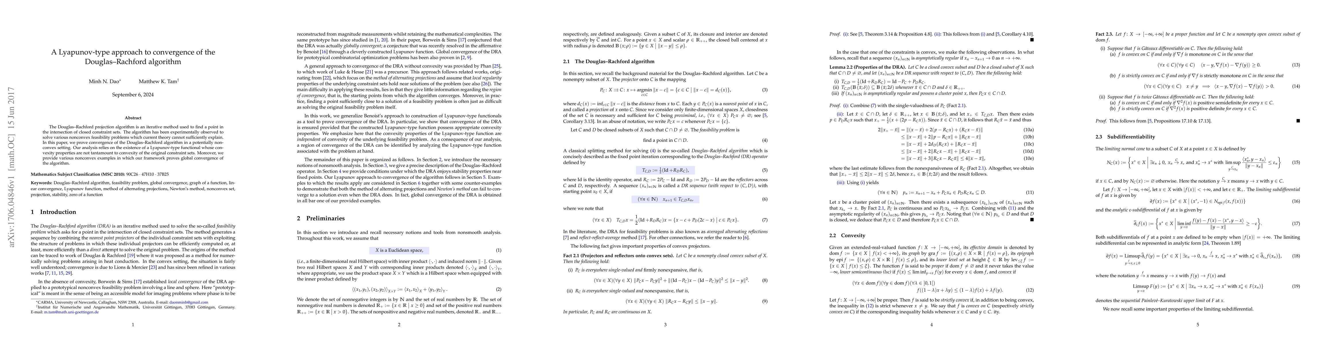 This paper proves the convergence of the Douglas-Rachford algorithm in nonconvex settings using a Lyapunov-type functional, demonstrating that the algorithm's success does not depend on the convexity of the constraint sets. The analysis provides examples of nonconvex problems where the algorithm achieves global convergence.