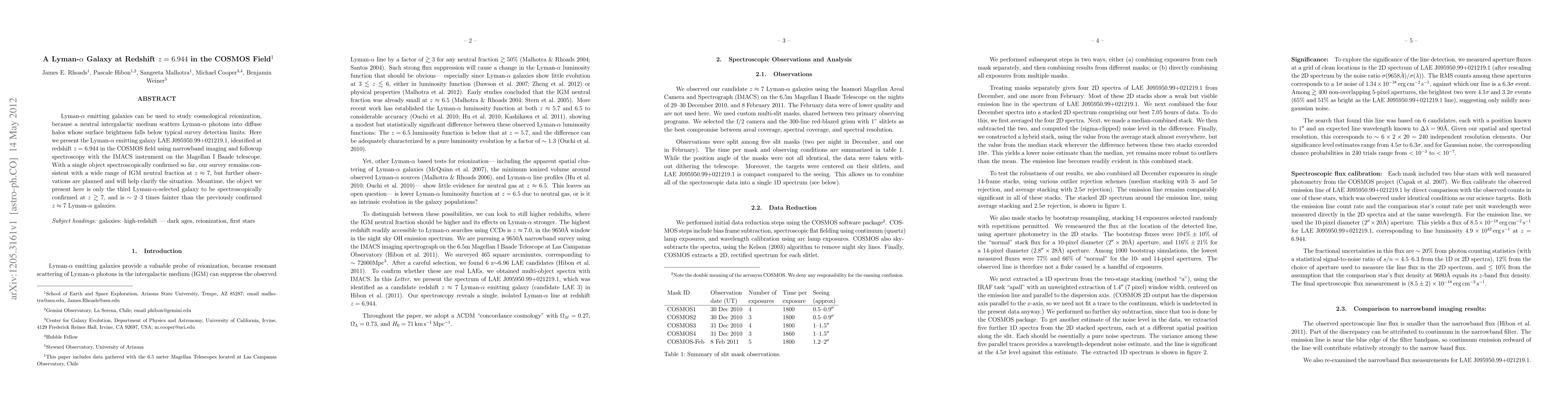 This paper identifies a Lyman-alpha emitting galaxy at redshift z=6.944 in the COSMOS field, providing insights into cosmological reionization. The galaxy, LAE J095950.99+021219.1, is only the third confirmed at this redshift and is significantly fainter than previously known examples.
