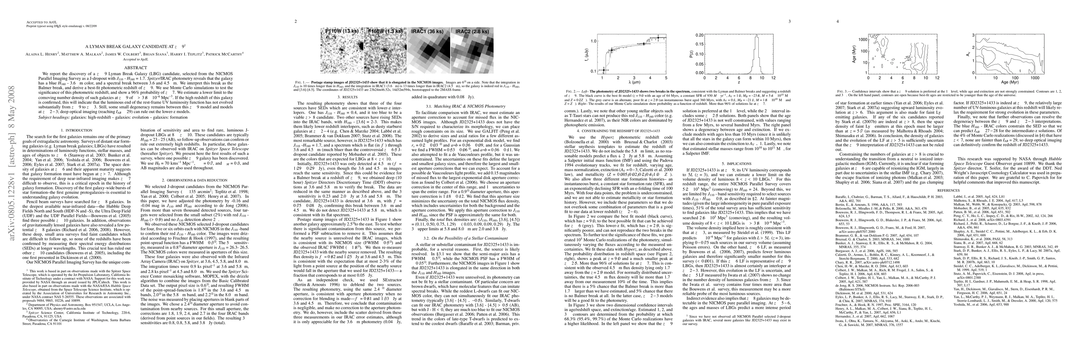 This paper reports the discovery of a z~9 Lyman Break Galaxy candidate, identified via J-dropout criteria and confirmed by Spitzer/IRAC photometry showing a Balmer break. The study estimates a lower limit on the comoving number density of such galaxies at z~9, suggesting minimal evolution in the luminous end of the UV luminosity function from z~9 to z~3.