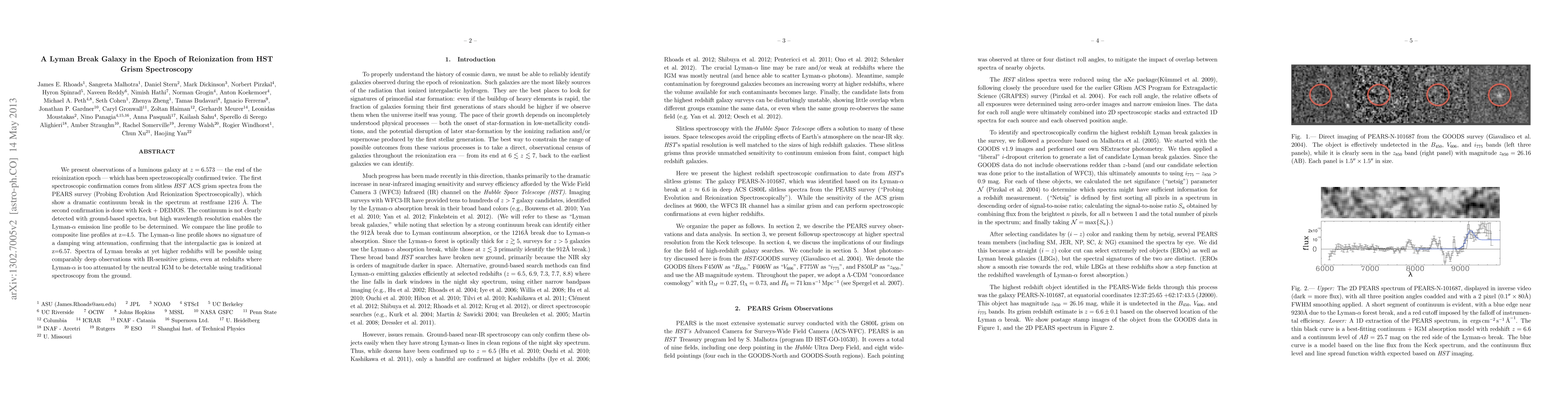 We present observations of a luminous galaxy at redshift z=6.573 --- the end of the reioinization epoch --- which has been spectroscopically confirmed twice. The first spectroscopic confirmation comes from slitless HST ACS grism spectra from the PEARS survey (Probing Evolution And Reionization Spectroscopically), which show a dramatic continuum break in the spectrum at restframe 1216 A wavelength. The second confirmation is done with Keck + DEIMOS. The continuum is not clearly detected with ground-based spectra, but high wavelength resolution enables the Lyman alpha emission line profile to be determined. We compare the line profile to composite line profiles at redshift z=4.5. The Lyman alpha line profile shows no signature of a damping wing attenuation, confirming that the intergalactic gas is ionized at redshift z=6.57. Spectra of Lyman breaks at yet higher redshifts will be possible using comparably deep observations with IR-sensitive grisms, even at redshifts where Lyman alpha is too attenuated by the neutral IGM to be detectable using traditional spectroscopy from the ground.