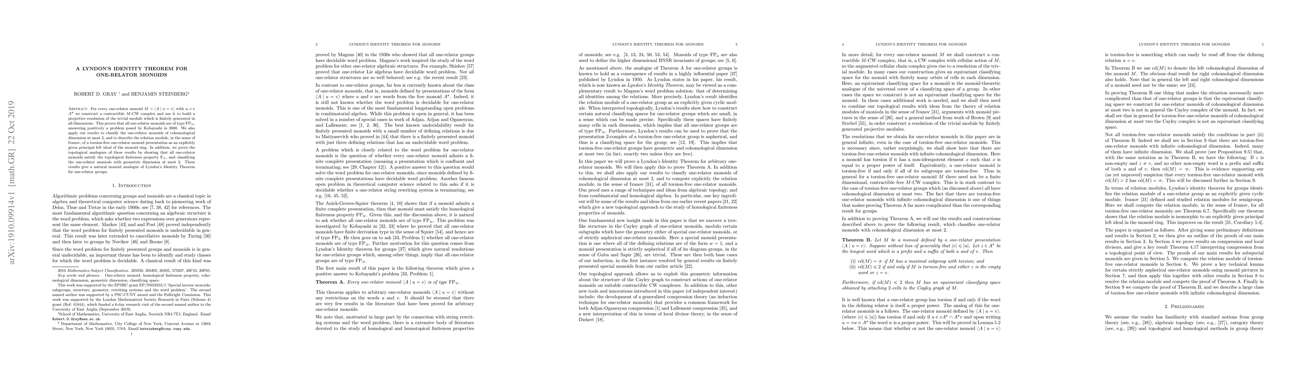 This paper constructs a contractible $M$-CW complex for one-relator monoids, proving they are of type ${\rm FP}_\infty$. It also classifies monoids of cohomological dimension at most $2$ and describes their relation modules, establishing topological analogues and the finiteness property ${\rm F}_\infty$.