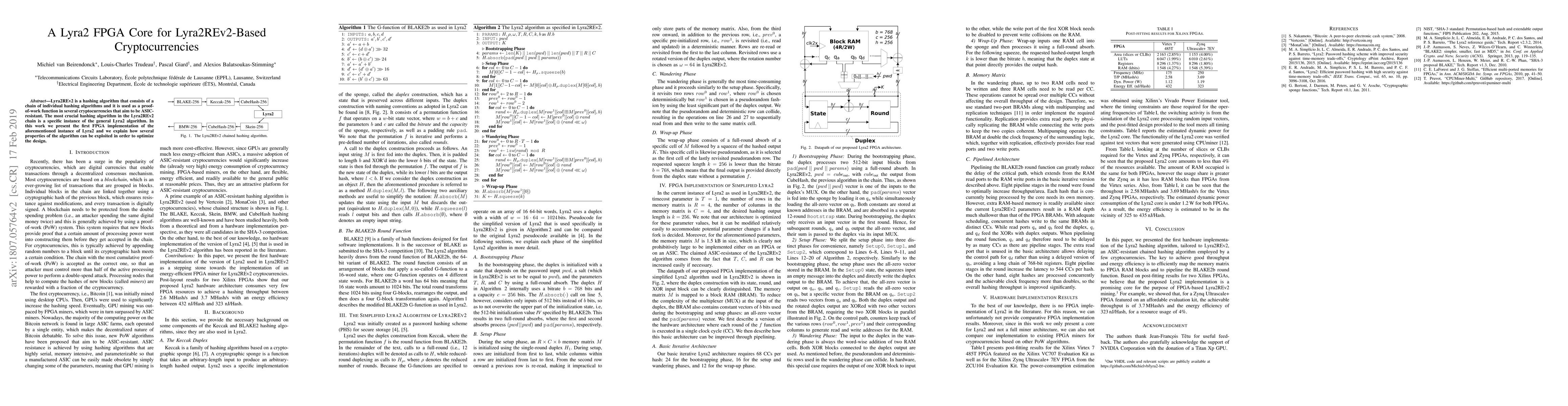 This paper presents the first FPGA implementation of the Lyra2 hashing algorithm, a key component of the Lyra2REv2 chain used in ASIC-resistant cryptocurrencies. The authors detail optimization strategies to enhance the design efficiency of the FPGA core.