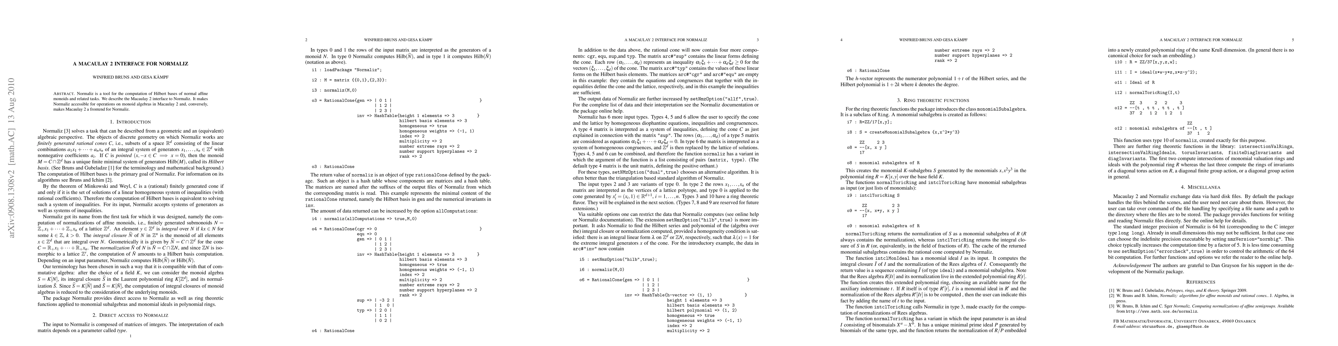 Normaliz is a tool for the computation of Hilbert bases of normal affine monoids and related tasks. We describe the Macaulay 2 interface to Normaliz. It makes Normaliz accessible for operations on monoid algebras in Macaulay 2 and, conversely, makes Macaulay 2 a frontend for Normaliz.