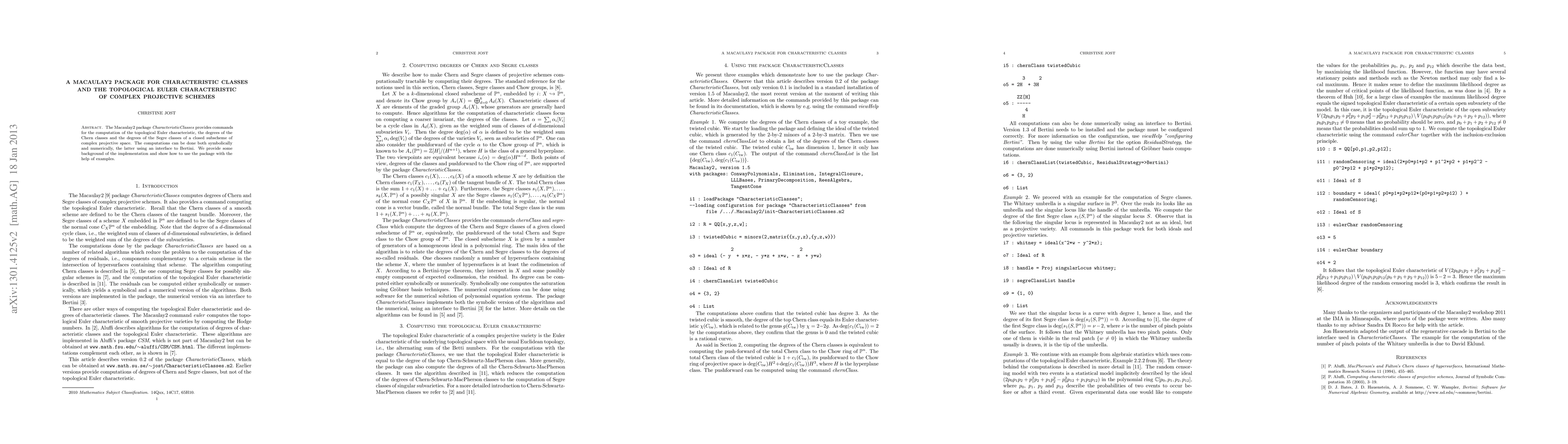 The Macaulay2 package CharacteristicClasses computes topological Euler characteristics and degrees of Chern and Segre classes for complex projective schemes, offering both symbolic and numerical computation methods. Examples demonstrate its practical application.