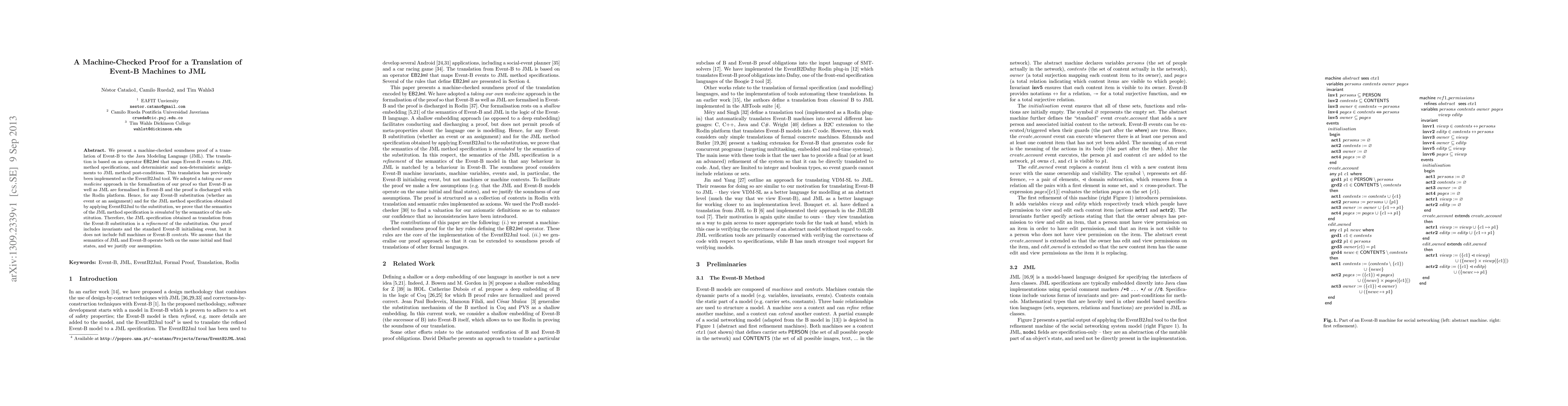 This paper presents a machine-checked proof for translating Event-B machines into JML specifications, ensuring the translation's soundness using the Rodin platform. The translation tool EventB2Jml maps Event-B events to JML method specifications, proving that the JML specifications refine the original Event-B models.