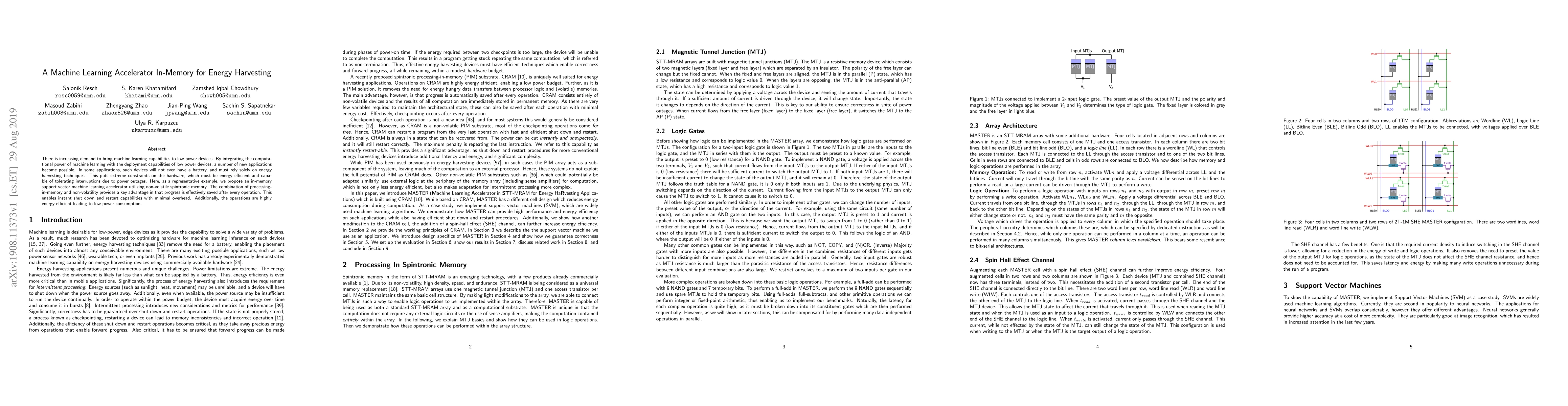This paper proposes a machine learning accelerator using in-memory processing and non-volatile spintronic memory to enable energy-efficient machine learning on low-power, battery-less devices that rely on energy harvesting. The design allows for instant shutdown and restart with minimal overhead, significantly reducing power consumption.