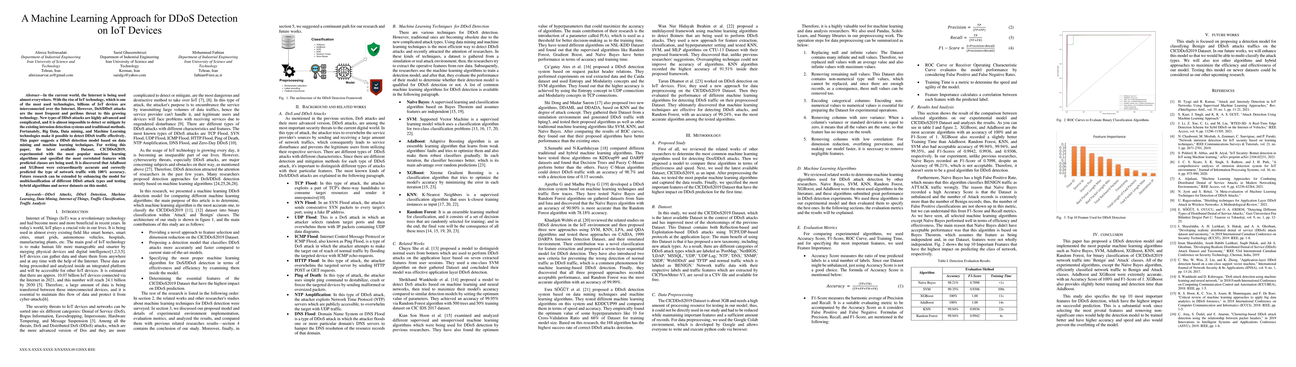 This paper proposes a machine learning model for detecting DDoS attacks on IoT devices using data mining and advanced algorithms like AdaBoost and XGBoost, achieving 100% accuracy. Future work could explore multiclassification of DDoS attacks and test hybrid algorithms with new datasets.