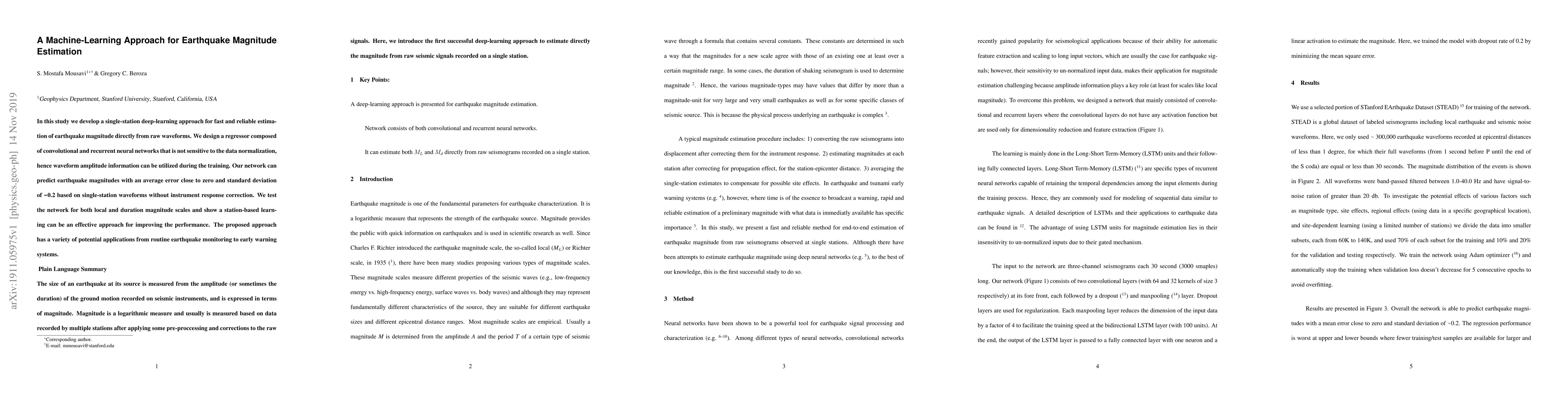 This paper presents a deep-learning model using convolutional and recurrent neural networks for estimating earthquake magnitude from single-station waveforms, achieving high accuracy with minimal error. The method demonstrates effectiveness for both local and duration magnitude scales, suggesting potential for routine monitoring and early warning systems.