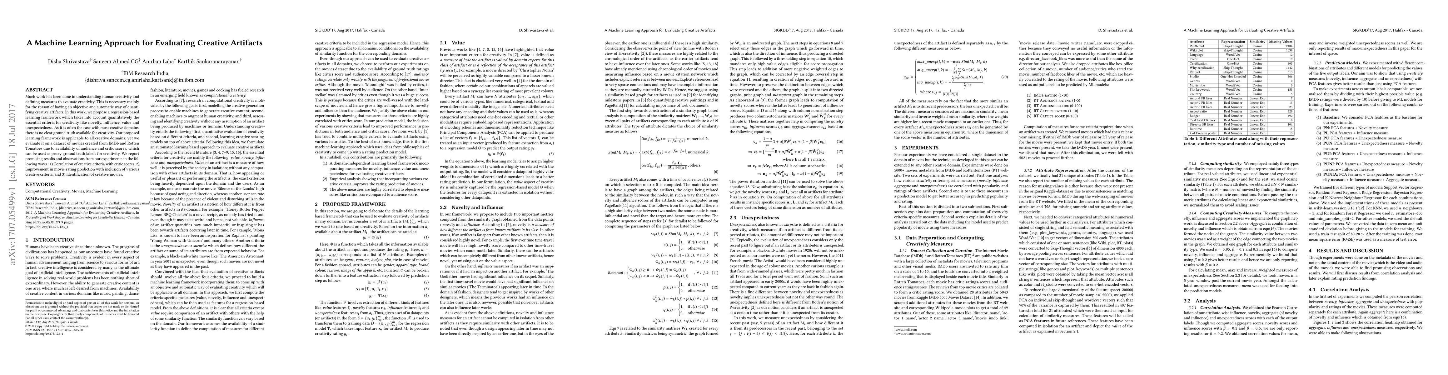 A machine learning approach evaluates creativity in art using a regression-based framework that incorporates criteria such as novelty, influence, and value, with promising results on movie ratings and identification of creative films.