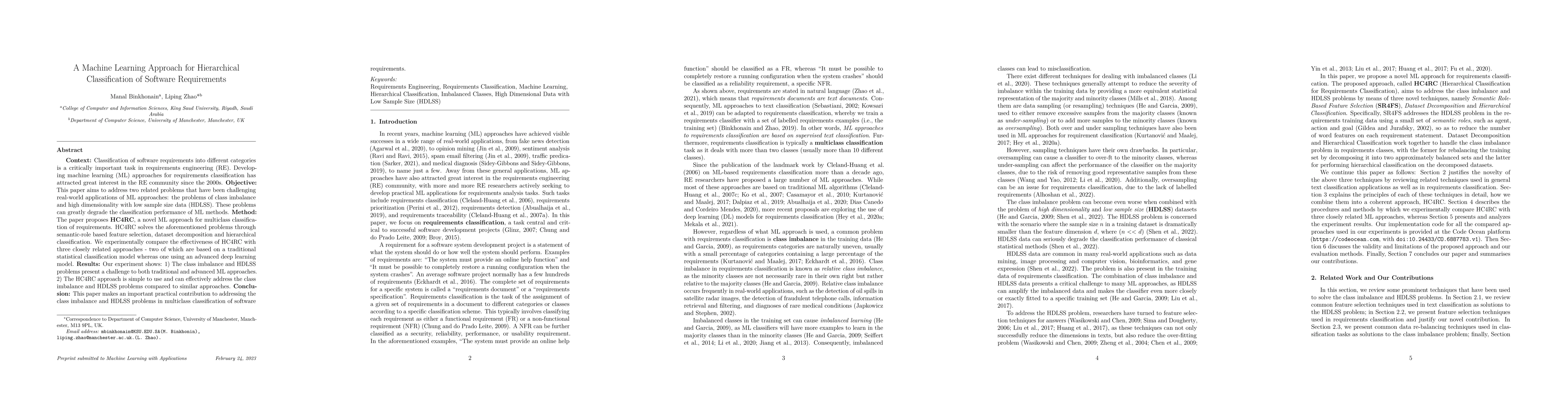 This paper introduces HC4RC, a machine learning approach for hierarchical classification of software requirements, addressing class imbalance and high dimensionality with low sample size data (HDLSS). Experimental results show that HC4RC outperforms traditional and advanced ML methods by effectively tackling these challenges.