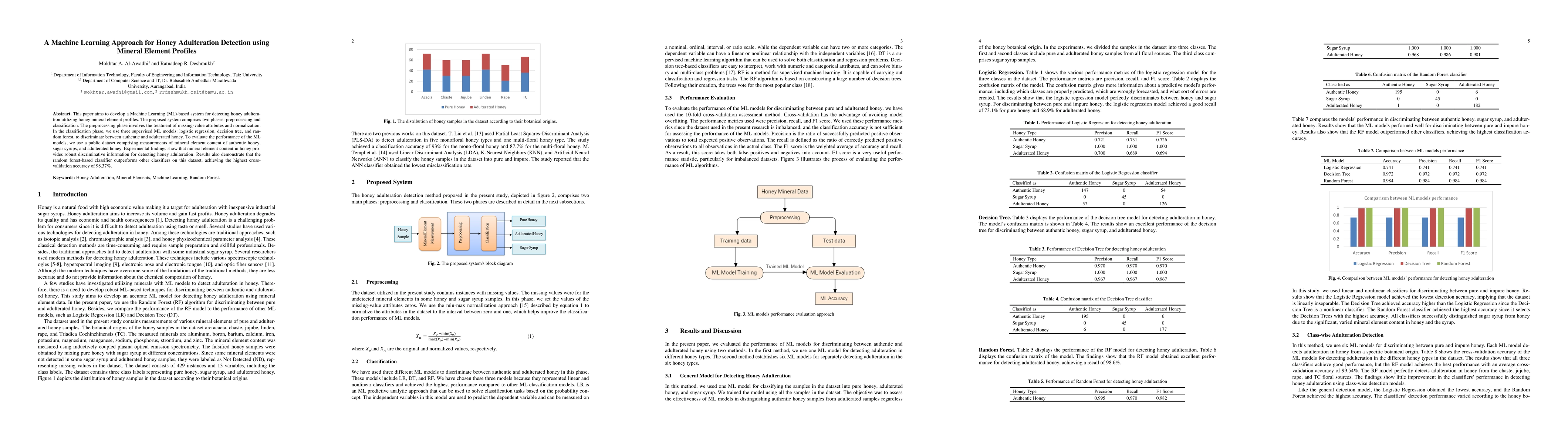 The paper presents a novel ML-based approach for honey adulteration detection using mineral element profiles, demonstrating the superior performance of the random forest classifier.