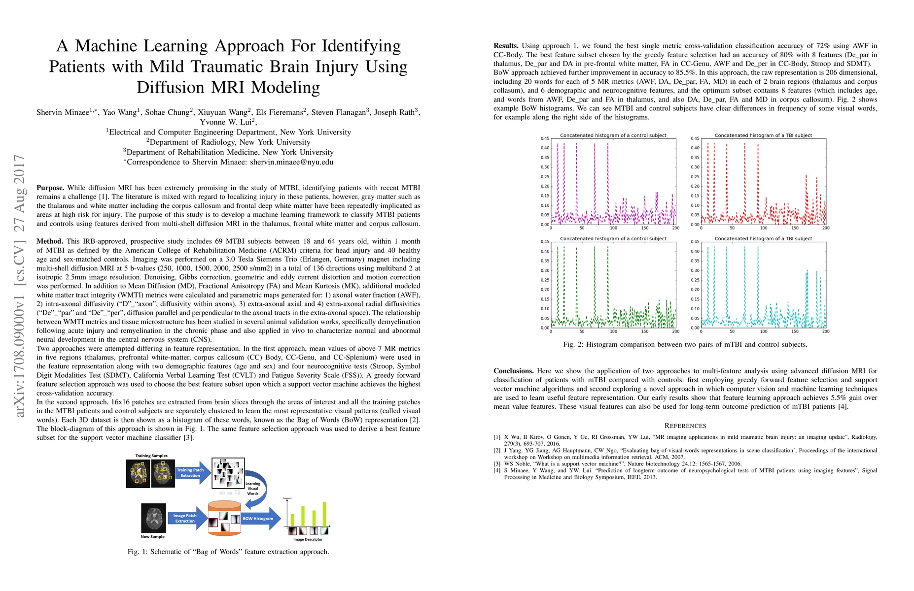 This study develops a machine learning framework to classify patients with mild traumatic brain injury (MTBI) from controls using features extracted from multi-shell diffusion MRI in high-risk areas like the thalamus, frontal white matter, and corpus callosum. The aim is to improve the identification of MTBI through advanced imaging analysis.
