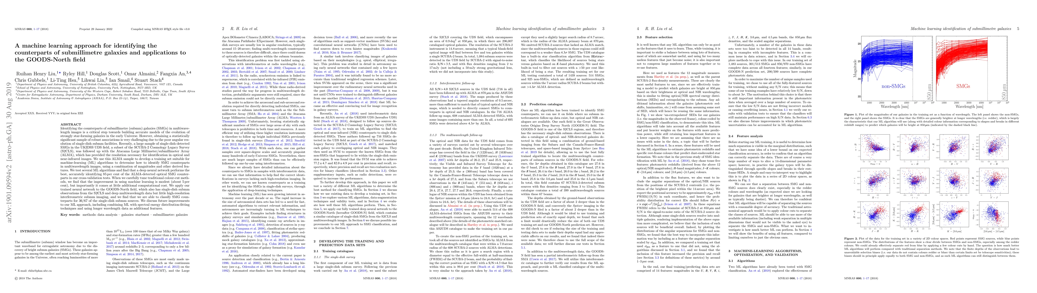 Identifying the counterparts of submillimetre (submm) galaxies (SMGs) in multiwavelength images is a critical step towards building accurate models of the evolution of strongly star-forming galaxies in the early Universe. However, obtaining a statistically significant sample of robust associations is very challenging due to the poor angular resolution of single-dish submm facilities. Recently, a large sample of single-dish-detected SMGs in the UKIDSS UDS field, a subset of the SCUBA-2 Cosmology Legacy Survey (S2CLS), was followed up with the Atacama Large Millimeter/submillimeter Array (ALMA), which has provided the resolution necessary for identification in optical and near-infrared images. We use this ALMA sample to develop a training set suitable for machine-learning (ML) algorithms to determine how to identify SMG counterparts in multiwavelength images, using a combination of magnitudes and other derived features. We test several ML algorithms and find that a deep neural network performs the best, accurately identifying 85 per cent of the ALMA-detected optical SMG counterparts in our cross-validation tests. When we carefully tune traditional colour-cut methods, we find that the improvement in using machine learning is modest (about 5 per cent), but importantly it comes at little additional computational cost. We apply our trained neural network to the GOODS-North field, which also has single-dish submm observations from the S2CLS and deep multiwavelength data but little high-resolution interferometric submm imaging, and we find that we are able to classify SMG counterparts for 36/67 of the single-dish submm sources. We discuss future improvements to our ML approach, including combining ML with spectral energy distribution-fitting techniques and using longer wavelength data as additional features.