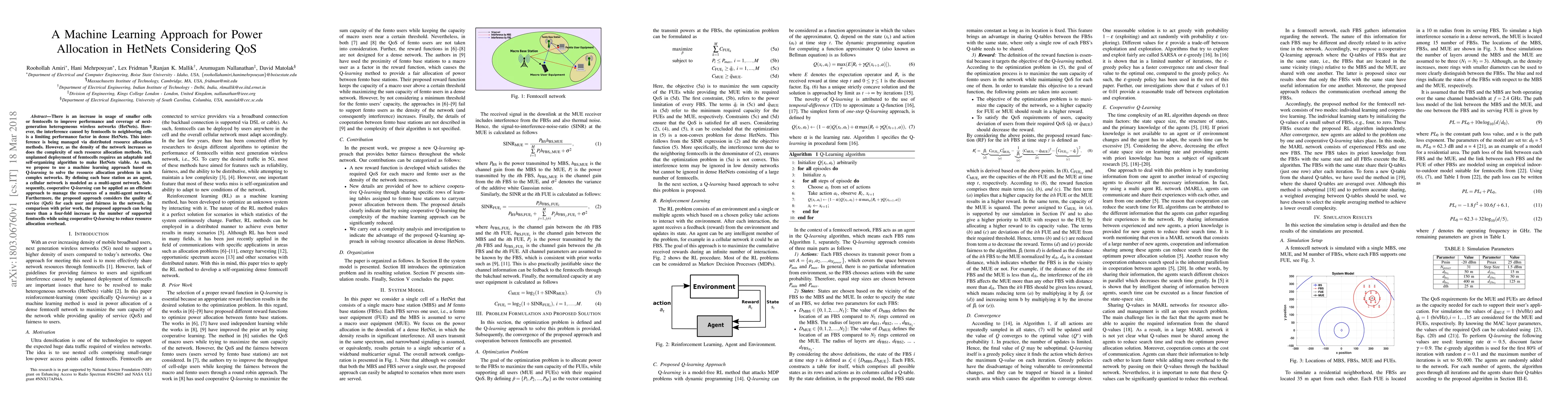 This paper proposes a machine learning-based Q-learning approach for power allocation in heterogeneous wireless networks (HetNets) to manage interference from femtocells, ensuring QoS and fairness. The method, modeled as a multi-agent network, significantly increases the number of supported femtocells while reducing resource allocation overhead.