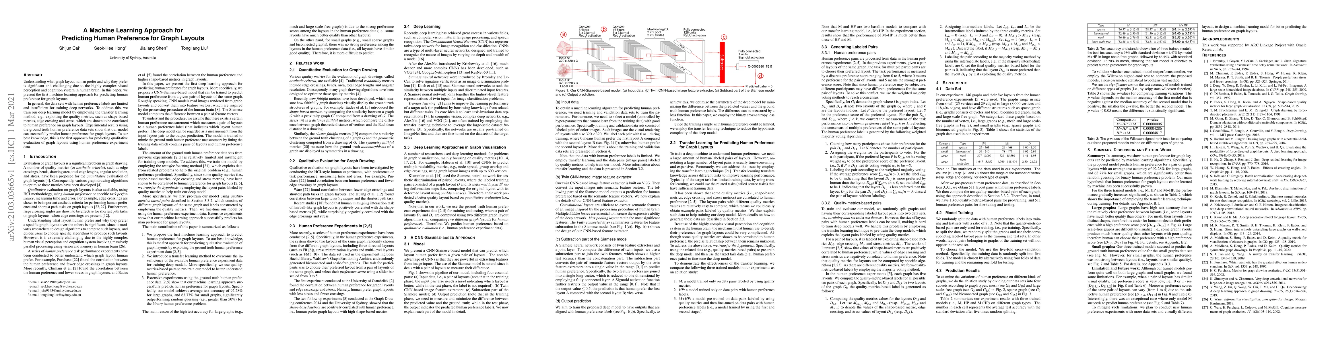 This paper introduces a machine learning method to predict human preference for graph layouts, addressing the challenge of limited human preference data by using transfer learning with quality metrics. Experimental results demonstrate the model's success in predicting human preferences based on ground truth data.